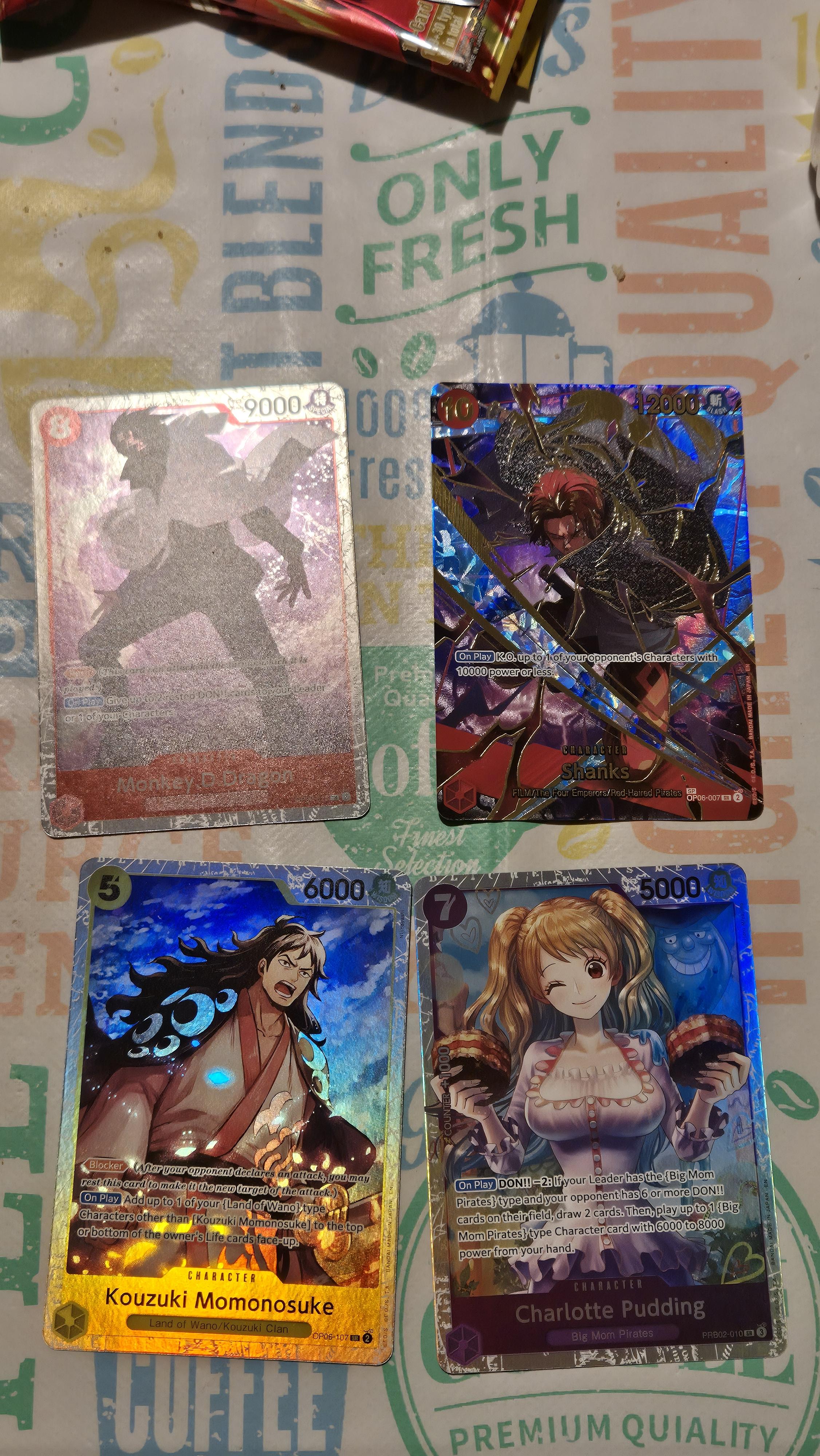 Oggi ho fatto shopping in due fumetterie, una per le carte e una per i manga (bye bye soldi), e ho comprato delle bustine di One Piece