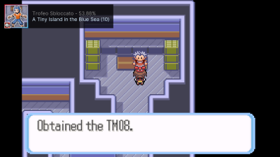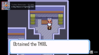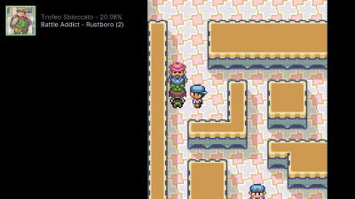 Pokémon Smeraldo è la versione che include più trofei dei tre, includendo ben 197(!) achievements rispetto ai 49 di Rubino/Zaffiro. Alcuni di questi trofei sono di progressione, impossibili da mancare, mentre altri saranno un tantino più impegnativi. Andiamo con ordine senza troppi giri di parole, perché fare il recap di RSE a chi ormai di Pokémon ne mastica molto più di me sarebbe un po' ridondante. - Assistiamo Lino nella cattura del suo Ralts per ottenere il trofeo "Little Brother". - Sconfiggiamo la Recluta Aqua senza troppe cerimonie e difficoltà per ottenere il trofeo "Woody Rumble". - Visitiamo la Fiorista Bel Petalo facendoci dare il Vaso Wailmer per avere il trofeo "Gardening Pro". (spoiler: non seminerò mai bacche nel corso del gioco) - Riceviamo il Rapidartigli dal professore della scuola di Ferrugipoli, ottenendo il trofeo "Good Student". - Con un secondo Ralts catturato in precedenza, facciamo lo scambio per ricevere il rarissimo Seedot (in Smeraldo) e anche il trofeo "Even The Mightiest Oak". In Smeraldo ci sarà anche un mini-set di trofei che chiamerò "Battle Addict", che consiste nel sconfiggere tutti gli Allenatori delle Palestre Pokémon. In pratica fare piazza pulita e non lasciare nessuno incolume. Il team per loro e per Petra era semplice: Marill e Beautifly per il vantaggio di tipo, Dustox e Ralts per Confusione e Dots e Torchic per ricordarmi che non sono un pro ai Pokémon ed è un miracolo che io sia riuscito a battere la Capopalestra con un Nosepass quasi morto ma intento a rocciotombare tutti e un Ralts debolissimo che è riuscito a crittare nel momento decisivo. Con questo climax ottengo il precedentemente menzionato trofeo "Battle Addict - Rustboro" e "Rockin' Whiz" per aver sconfitto Petra e il suo entourage. Proseguendo per la trama dove catturo anche l'esclusivo Abra e sconfiggendo la Recluta Aqua di nuovo, ottengo il PokéNav e il trofeo "Amazing Tech in the Palm of Your Hand". Con Ferrugipoli fatta in tutte e tre le versioni, si prosegue per la prossima tappa: Bluruvia -