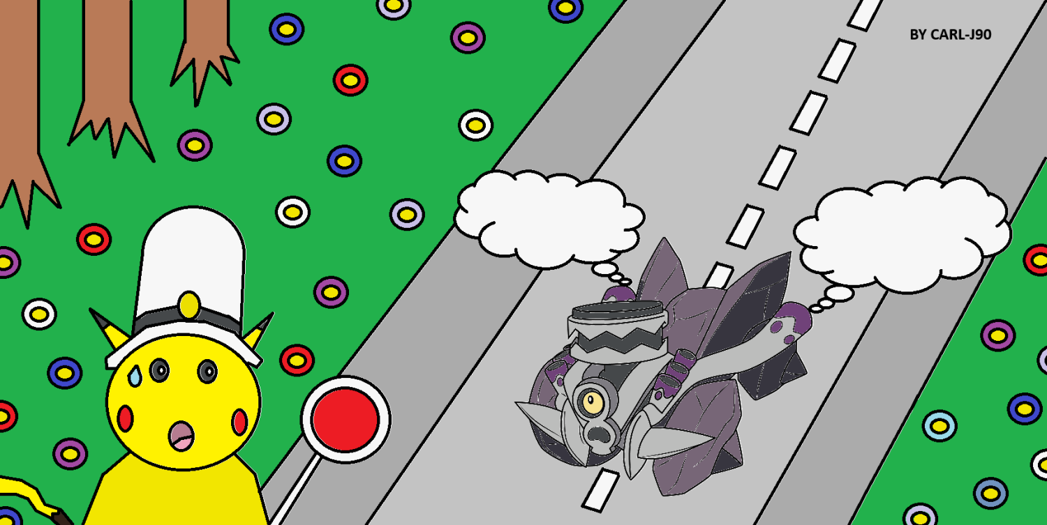Ecco qui il mio lavoro per il tema di oggi: [GIORNO 24 - URBANO]: Descrizione: Un Pikachu vigile urbano, durante il suo turno incentrato sul dirigere il traffico, viene colto di sorpresa dall'arrivo di un Revavroom che, in attesa del suo via libera, è impegnato nel sgasare con un rombo assordante. Crediti: Nintendo, The Pokèmon Company, Game Freak, Carl-J90, coloringpages101.com