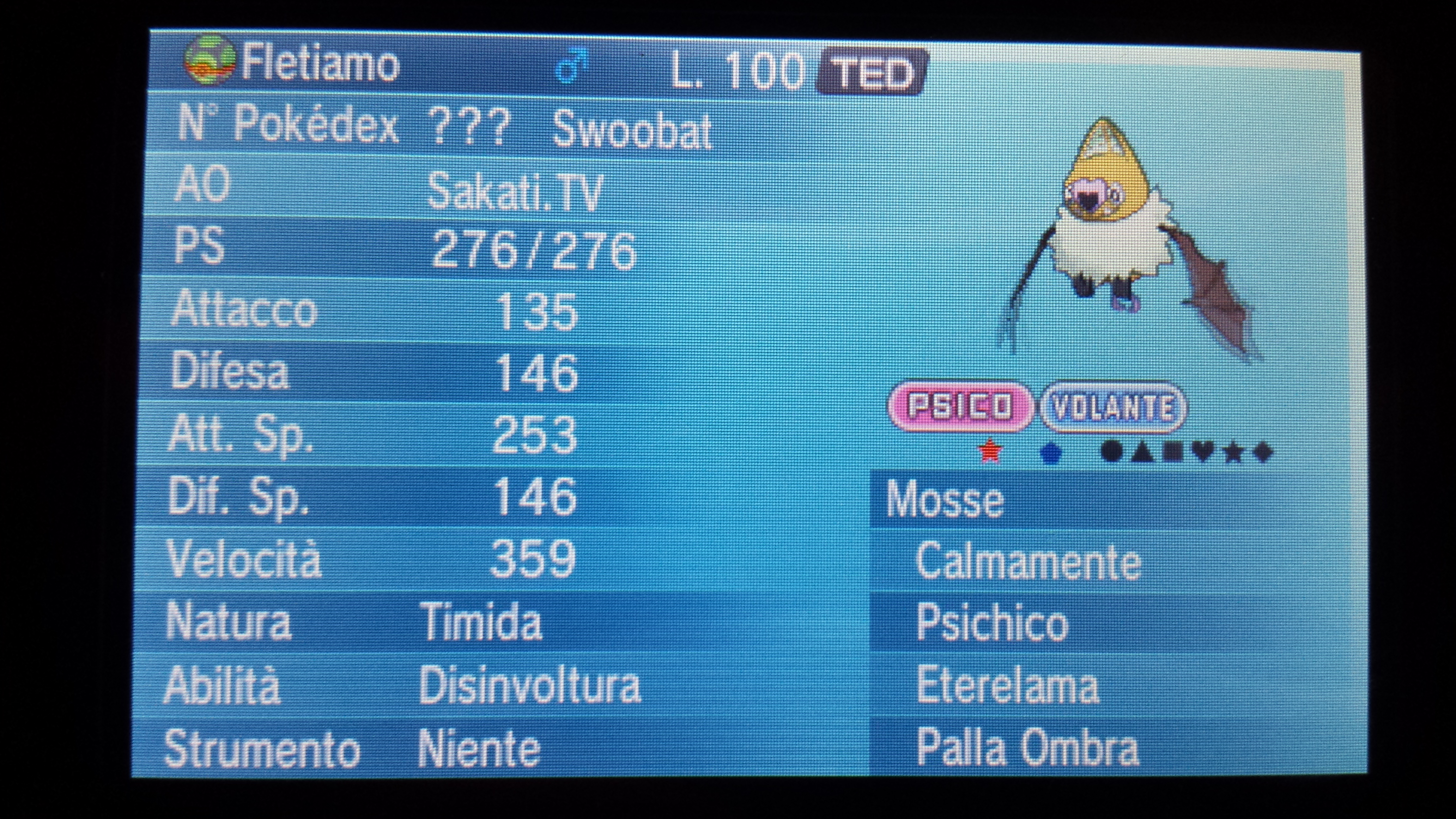 Arydo Inviato 25 agosto, 2016 Inviato 25 agosto, 2016 Ciao a tutti, spero innanzitutto di aver azzeccato la sezione giusta, essendo nuovo. Ho avuto la fortuna di imbattermi in uno Scambio Prodigioso, ed ho ottenuto uno Swoobat Shiny con 6Ivs a 31. Swoobat Maschio Lv.100 Natura: Timida Abilità: Disinvoltura Mosse: Calmamente, Psichico, Eterelama, Pallaombra EVS: 252 SpA e 252 Spe Volevo sapere un po' il vostro parere... È un buon pokemon? Potrei scambiarlo per qualcosa di buono? Anche perché ho iniziato da due giorni e non posso usare un pokemon al 100. Vorrei avere anche qualche offerta. Ovviamente mi interessano Shiny Ivsati e con Natura giusta. P.s: Si, lo ho ottenuto da un certo Sakati.Tv... ho scoperto che è un tizio che stremma Pokemon e che alleva un botto di Shiny XD