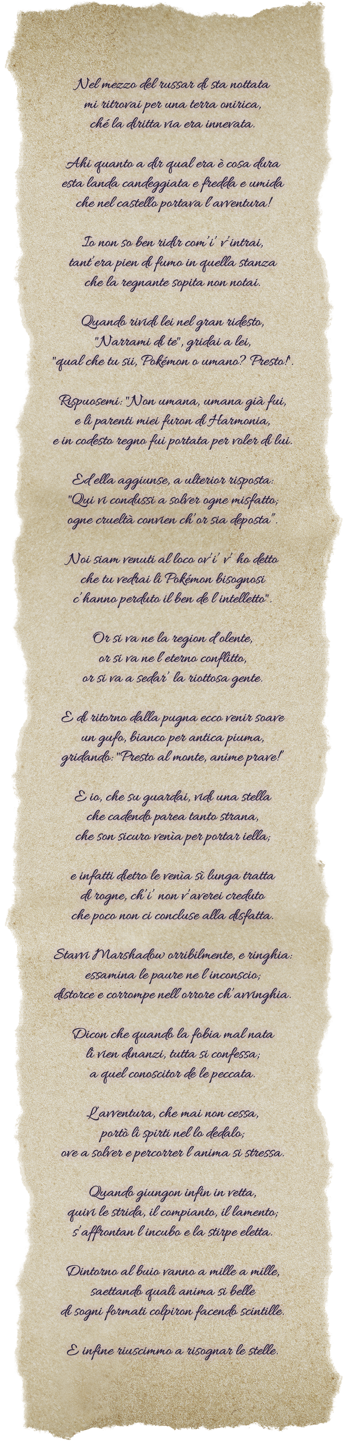 Per la precisione, parliamo di terzine ispirate dall'Inferno. Notabili l'intro del primo canto dell'Inferno e l'apparizione di un Marshadow Minosse preso dal quarto Canto. Anche altri parti sono riconoscibili.