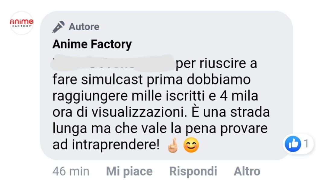 Stefano M Inviato 22 novembre, 2020 Inviato 22 novembre, 2020 2 ore fa, BloodyRed ha scritto: Ragazzi news abbastanza rilevante, Anime Factory pare abbia intenzione di utilizzare il suo canale YouTube per proporre qualche anime in simulcast Una loro risposta sotto il post di facebook aggiunge qualche info in più Nascondi contenuto Bella iniziativa in attesa di scoprire quali anime potrebbero comparire, al momento della mia iscrizione gli iscritti risultano già 800 quindi si spera che l'interesse suscitato possa presto far raggiungere i numeri richiesti per far partire la cosa E' stata aggiunta una reazione da BloodyRed e Drake 1 1
