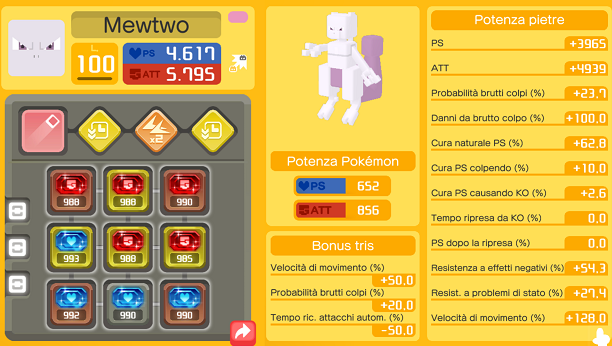 Tanino Inviato 20 ottobre, 2018 Inviato 20 ottobre, 2018 @ZaffiraIo uso questi in modalità automatica, funziona contro tutti i nemici ad eccezione di kabutops/omastar: poi dipende anche dagli slots e pietre che usi. Io nel mio caso ho un defender (onix) con gli slots quasi full difesa; un setter (mewtwo) con slots metà e metà; un attacker (machamp) con gli slots quasi full attacco. Ovviamente poi le pietre hanno anche i loro bonus, ma non sto qui ad elencarli tutti altrimenti non finiamo più. P.s. Con queste pietre Mewtwo e Onix resistono ad un iper raggio di Mew, quindi non rischi che te li shotta.