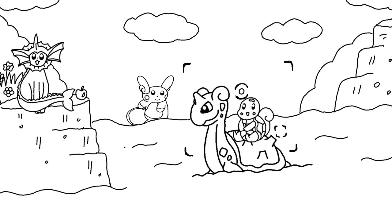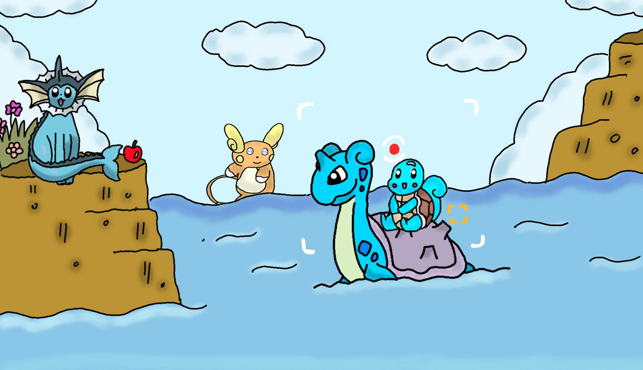 C'e vapoereon in posa sulle rocce con la mela vicino,lapras con squirtle e raichu alola che fa surf