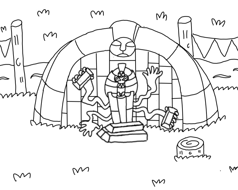 Disegno del negozio "oro ti adoro " di cofagiarus in mistery dungeon dove potevi scambiare lingotti d'oro per strumenti vari scelto per il tema oro