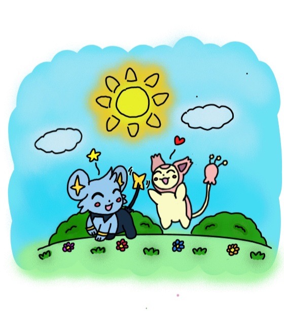 Il soggetto è shinx che agitando la sua coda fa giocare un piccolo skitty...volevo usare un gatto di 4 gen ma c'era solo purugly e glemeow troppo grossi per la scena so skitty sia
