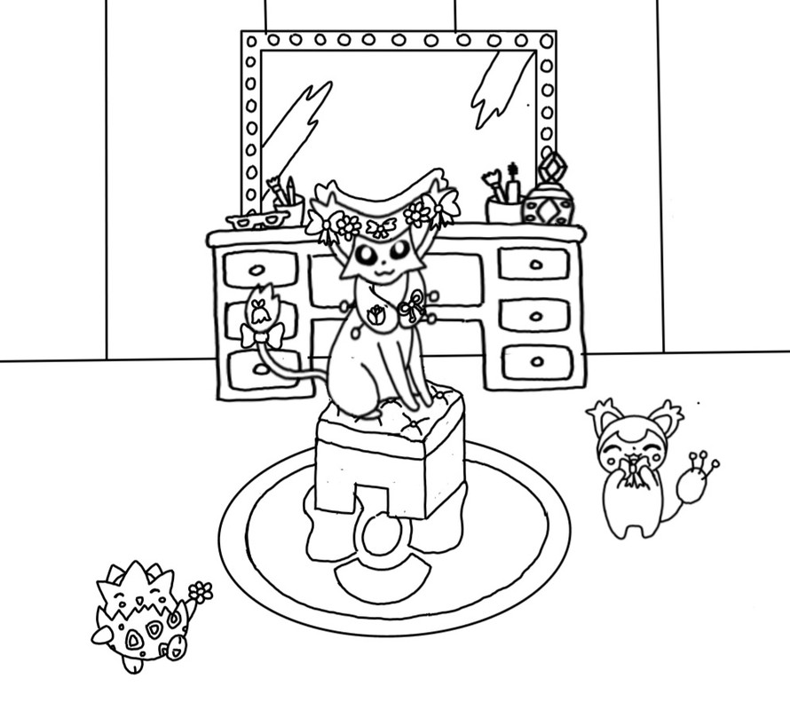 Delcatty si prepara per una gara poke coi piccoli assistenti skitty e togepi che glimportano accessori per il tema delcatty