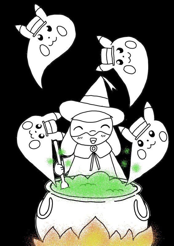 Mago lucario che fa pozioni coi fantasmini pika per il tema calderone