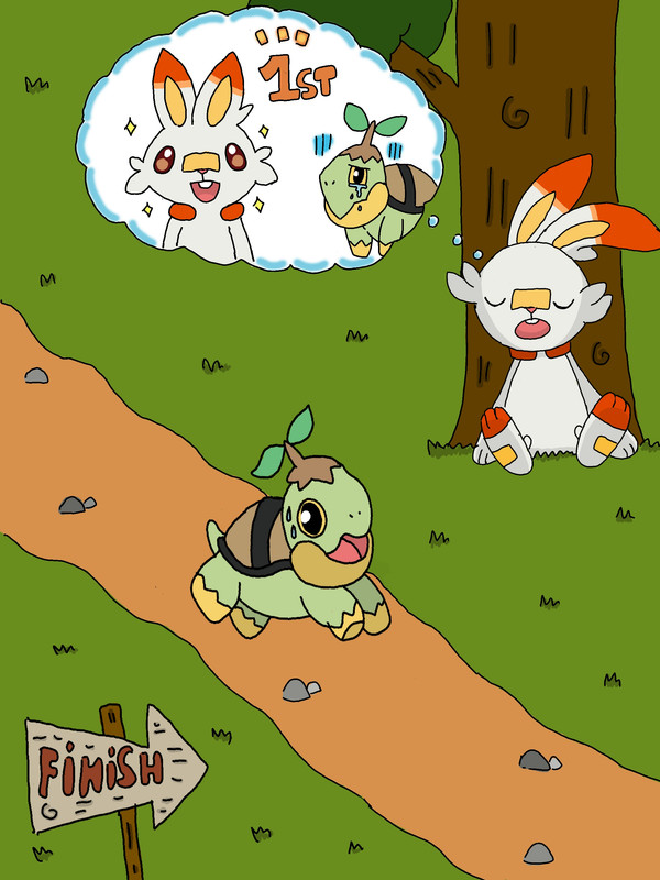 La lepre e la tartaruga con turtwig che fa la nostra tartaruga e scorunny che fa la nostra lepre