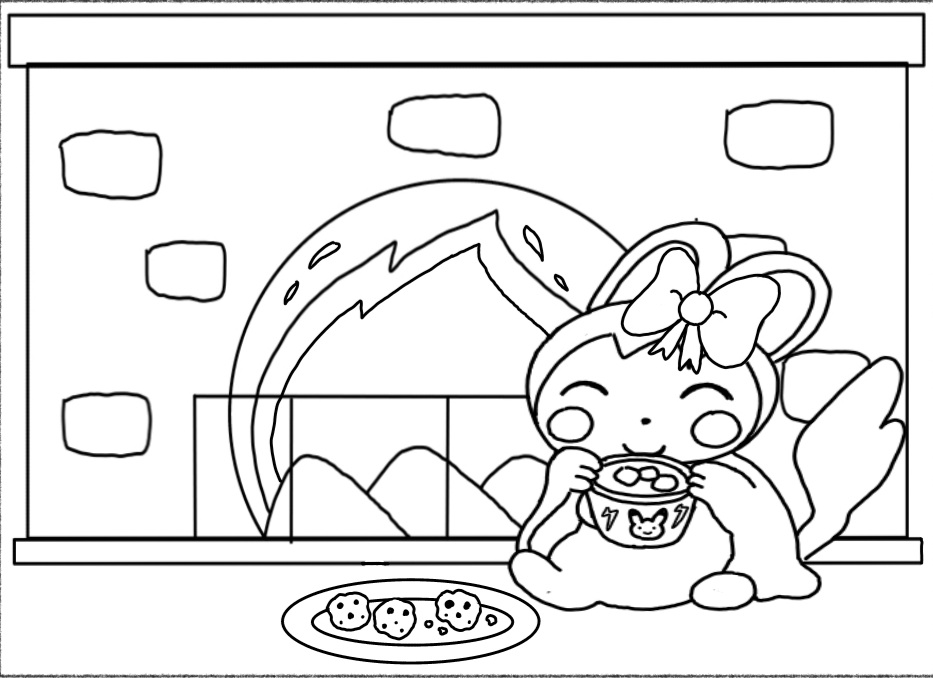 Ecco emolga che si rilassa davanti al camino con una tazza di cioccolata calda coi marshmellow e un bel vassoio di biscotti