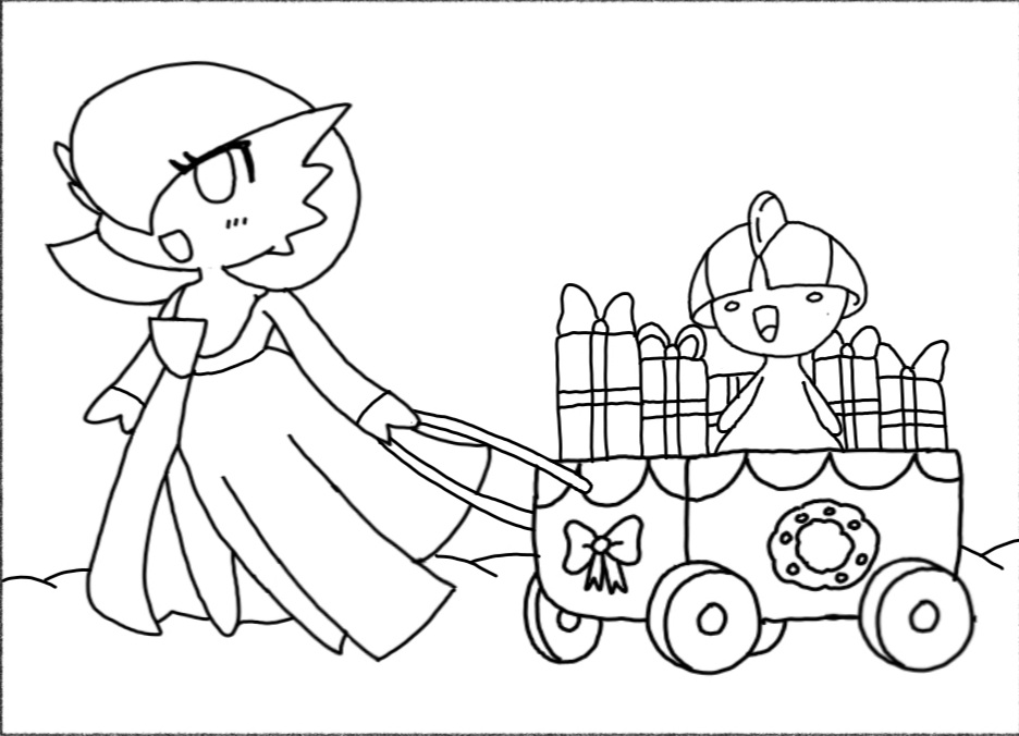 Gardevoir ha comprato un bel po di regalini e li porta in giro col carellino mentre ralts si fa un giretto tra i regali