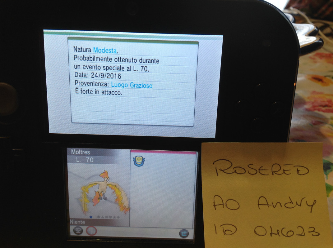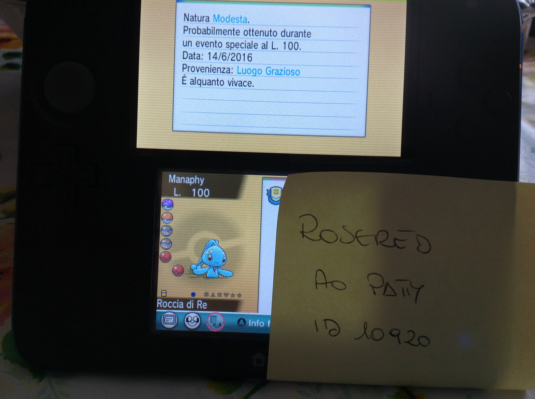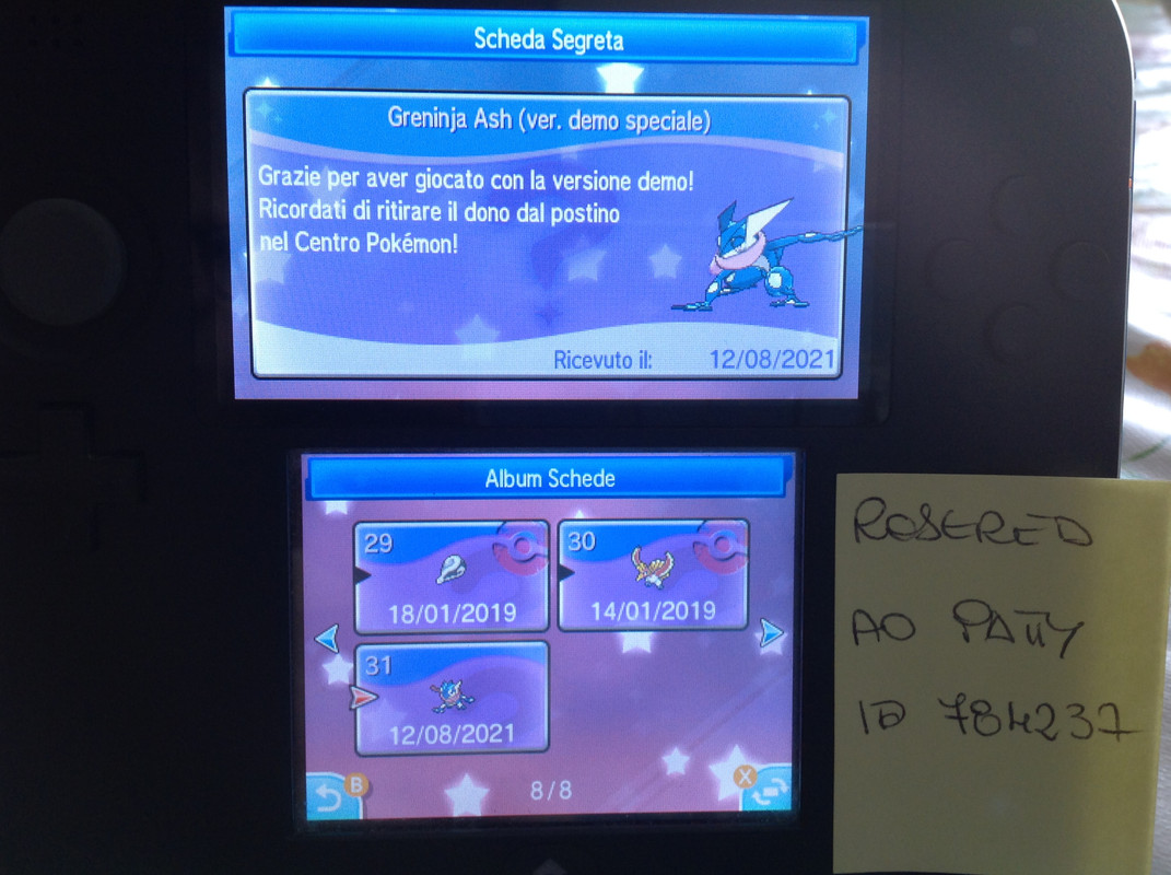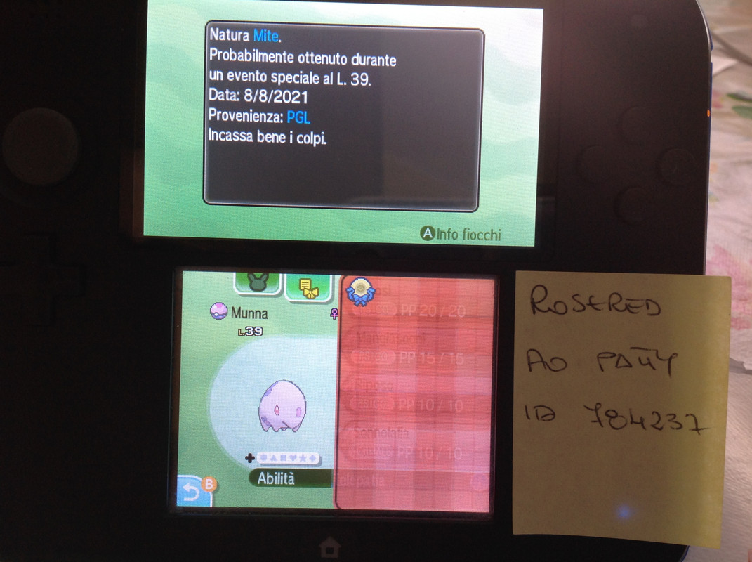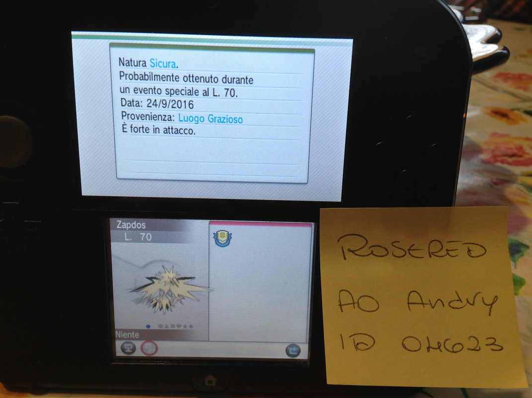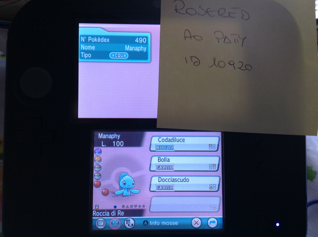 RoseRed Inviato 22 gennaio, 2020 Inviato 22 gennaio, 2020 (modificato) I pokemon evento qui presenti, riscattati da me, non potranno essere rivenduti in nessun mercatino, asta o privatamente! Sono frutto di innumerevoli softreset per offrire non solo eventi in quanto tali, ma eventi con nature e statistiche il quanto più ottimali ( cosa molto difficile per i pokemon vintage per i quali non c'era la regola di minimo 3 statistiche al 31)! Tutti gli eventi sono stati clonati con il backup del salvataggio e potranno essere scambiati su USUM e/o SwoShi e/o Perla e Diamante! Elencate qui ciò che vi interessa e poi mandatemi un messaggio... Non scambio su HOME Tutti gli starter dei precedenti giochi sono stati da me breedati in aprimons, dandogli egg moves. L'AO sarà RoseRed 333858. Avranno tutti 5 ivs come da loro natura. Sesso e Abilità saranno random e il teratipo corrisponderà al loro tipo. Costo 0.15 pp cadauno, per più richieste si effettueranno sconti. Costo scarti 0.07 pp. Spoiler -Bulbasaur dream ball /modest (Capocciata-Tossina-Maledizione-Radicamento) -Charmander level ball/timid (Forzantica-Dragofuria-Codacciaio-Panciamburo) -Squirtle lure ball/careful (Specchiovelo-Nebbia-Bruciapelo-Acquagetto) -Chikorita friend ball/calm (Forzantica-Frustata-Curapulsar-Contrattacco) -Cyndaquil level ball/timid (Extrasenso-Doppiocalcio-Supplica-Maledizione) -Totodile lure ball/jolly (Forzantica-Contrattacco-Acquagetto-Blocco) -Treecko friend ball/timid (Nottesferza-Lacerazione-Dragospiro-Doppiocalcio) -Torchic level ball/adamant (Nottesferza-Beccata-Contrattacco-Tritartigli) -Mudkip lure ball/jolly (Fango-Morso-Pestone-Specchiovelo) -Turtwig friend ball/jolly (Colpo-Affannoseme-Troppoforte-Bodyguard -Chimchar dream ball/timid (Contrattacco-Bruciapelo) -Piplup moon ball/calm (Sbadiglio-Trespolo-Tracotanza-Acquanello) -Snivy friend ball/timid (Codacciaio-Sintesi-Tornado-Specchiovelo) -Tepig level ball/jolly (Colpo-Sbadiglio-Sbigoattacco-Troppoforte) -Oshawott lure ball/modest (Eterelama-Idrotaglio-Nottesferza-Spadasolenne) -Chespin friend ball/bold (Superzanna-Maledizione-Panciamburo-Sintesi) -Fennekin rapid ball/timid (Copione-Desiderio-Ipnosi-Magicozona) -Rowlet safari ball/jolly (Scacciabruma-Trespolo-Privazione-Stordiraggio) -Litten level ball/adamant (Bruciapelo-Monito-Tracotanza) -Popplio moon ball/modest (Acquanello-Goccia Vitale-Ultimocanto) -Grookey friend ball/jolly (Bruciapelo-Martelpugno-Parassiseme-Forza) -Scorbunny rapid ball/jolly (Calcinvolo-Sbigoattacco-Superzanna-Turbosabbia) -Sobble moon ball/timid (Acquagetto-Pungiglione-Geloscheggia-Doppioteam) Jirachi Cromatico Tanabata costo 3.00 pp -Jirachi Tanabata Cromatico Liv. 10/AO たなばた/ID 08014/Leggiadro/Timido/x-31-x-31-31-x/Pregio ball/Desiderio/Comete/Curardore/Forza Lunare/Provenienza Kalos/data ottenimento agosto 2014/Dynamax 0 Rayquaza Cromatico Evento costo 3.00 pp -Rayquaza Cromatico Liv. 70/AO Galileo/ID 08055/Riparo/Audace/31-x-31-31-x-x/Pregio ball/Dragartigli/Extrarapido/Dragodanza/Ascesa del Drago/Provenienza Hoenn/data ottenimento settembre 2015/Dynamax 0 Tapu Fini Cromatico Evento costo 2.50 pp -Tapu Fini Cromatico Liv. 60/AO Poni/ID 190524/Nebbiogenesi/Calma/31-31-x-31-x-x/Pregio ball/Ira della Natura/Fanghiglia/Acquanello/Idropompa/Provenienza Alola/data ottenimento luglio 2019/Dynamax 0 Tapu Koko Cromatico Evento costo 2.50 pp -Tapu Koko Cromatico Liv. 60/AO MeleMele/ID 170714/Elettrogenesi/Timido/31-x-x-31-x-31/Pregio ball/Ira della Natura/Scarica/Agilità/Energisfera/Provenienza Alola/data ottenimento agosto 2017/Dynamax 0 Zygarde Cromatico Evento costo 2.50 pp - Zygarde Cromatico Liv. 60/AO Leggende2018/ID 060218/Frangiaura/Scaltro/31-x-31-31-x-x/Pregio ball/Forza Tellurica/Sguardo Feroce/Salvaguardia/Dragospiro/Provenienza Luogo Grazioso/data ottenimento giugno 2018/Dynamax 0 Spoiler Silvally Cromatico Evento costo 2.50 pp -Silvally Cromatico Liv. 100/AO Aether/ID 102317/Primevo/Timido/31-x-x-31-x-31/Pregio ball/Multiattacco/Monito/Visotruce/Provenienza Alola/data ottenimento Novembre 2017/Dynamax 0 Spoiler Poipole Cromatico Evento costo 2.50 pp - Poipole Cromatico Liv. 40/AO Ultra/ID 091718/Ultraboost/Modesto/30-31-x-31-x-31/Pregio ball/Velenotrappola/Congiura/Velenpuntura/Dragopulsar/Provenienza Luogo Grazioso/data ottenimento Ottobre 2018/Dynamax 0 Spoiler https://i.postimg.cc/PqsJBRCb/IMG-1722.jpg https://i.postimg.cc/kG4gQrHC/IMG-1751.jpg https://i.postimg.cc/7YjZ2Wnv/IMG-1752.jpg Mewtwo Cromatico Evento costo 3.00 pp - Mewtwo Cromatico Liv.100/AO Play!2016/ID 07266/Agitazione/Timido/31-x-x-31-31-31/Pregio ball/Psicobotta/Psichico/Ripresa/Forzasfera/Provenienza Kalos/data ottenimento agosto 2016/Dynamax 0 Spoiler Solgaleo Cromatico Evento costo 2.50 pp -Solgaleo Cromatico Liv.60/AO Eclipse/ID 100419/Metalprotezione/Allegro/x-31-x-x-31-31/Pregio ball/Astrocarica/Cozzata Zen/Urlo/Mattindoro/Provenienza Alola/data ottenimento novembre 2019/Dynamax 0 Spoiler https://i.postimg.cc/fbzpC4mH/IMG-1757.jpg https://i.postimg.cc/c1pzjtft/IMG-1758.jpg https://i.postimg.cc/6pwm6sj9/IMG-1765.jpg https://i.postimg.cc/rwJYKh35/IMG-1766.jpg Lunala Cromatico Evento costo 2.50 pp -Lunala Cromatico Liv.60/AO Eclipse/ID 100419/Spettroguardia/Ingenuo/31-x-x-31-x-31/Pregio ball/Raggio d'Ombra/Psicoshock/Forza Lunare/Lucelunare/Provenienza Alola/data ottenimento novembre 2019/Dynamax 0 Spoiler https://i.postimg.cc/28CVf7pp/IMG-1753.jpg https://i.postimg.cc/brpNppB0/IMG-1755.jpg https://i.postimg.cc/FFVHGkYT/IMG-1756.jpg https://i.postimg.cc/V6RP9MKM/IMG-1761.jpg Charizard Cromatico Evento costo 2.50 pp -Charizard Cromatico Liv.36/AO PRIMAVERA15/ID 04015/Aiutofuoco/Timido/30-x-x-x-x-31/Pregio ball/Vampata/Solarraggio/Focalcolpo/Mano nella Mano/Provenienza Kalos/data ottenimento maggio 2015/Dynamax 0 Spoiler Gengar Cromatico Evento costo 2.50 pp -Gengar Cromatico Liv.25/AO OTTOBRE14/ID 10134/Corpofunesto/Modesto/31-x-x-31-x-x/Scuro ball/Palla Ombra/Fangonda/Stordiraggio/Sgomento/Provenienza Kalos/data ottenimento ottobre 20