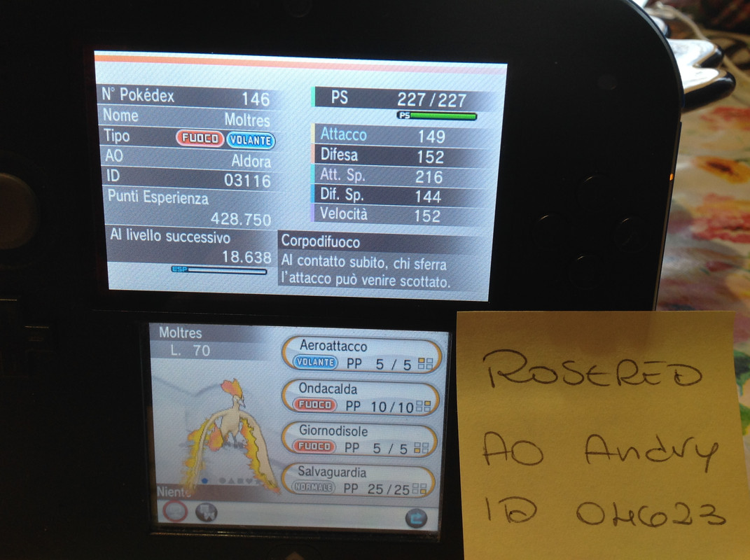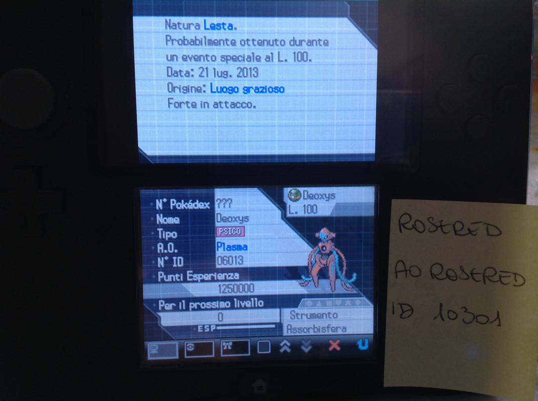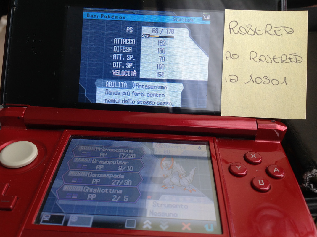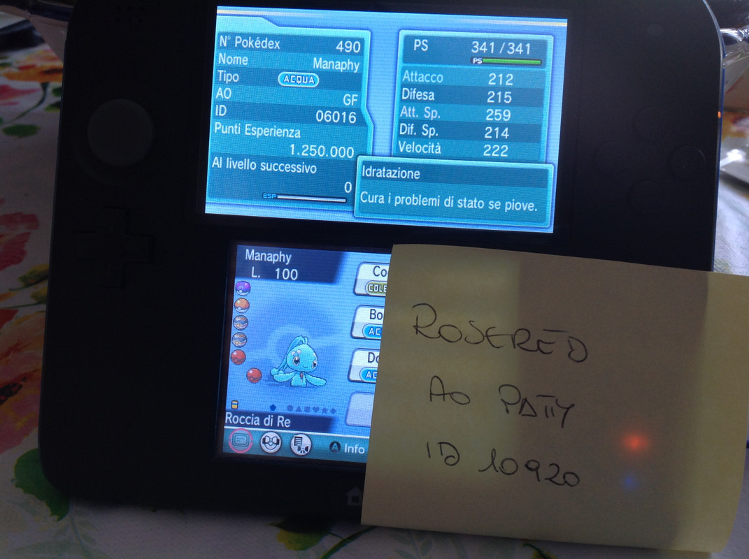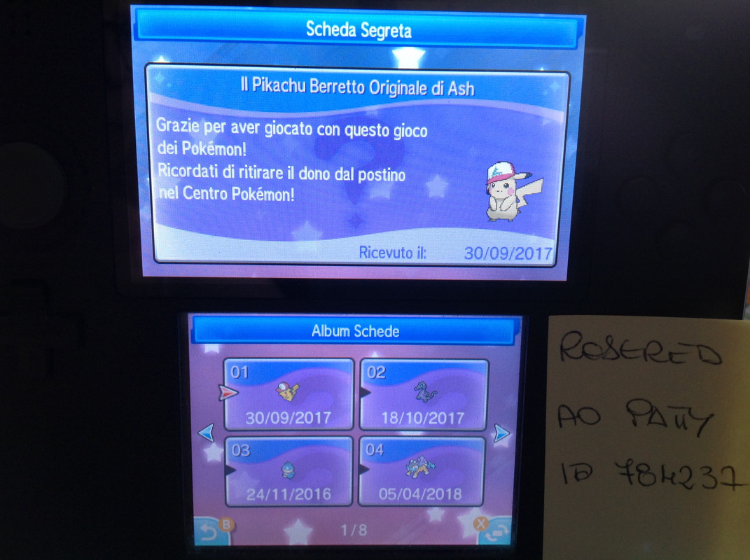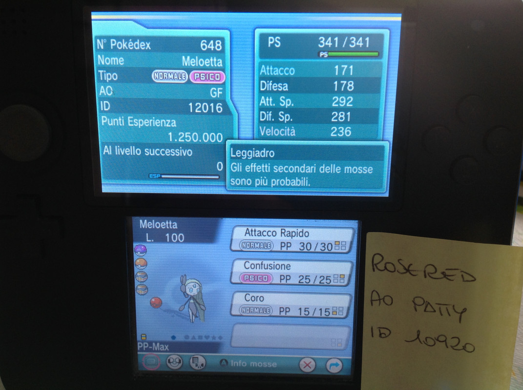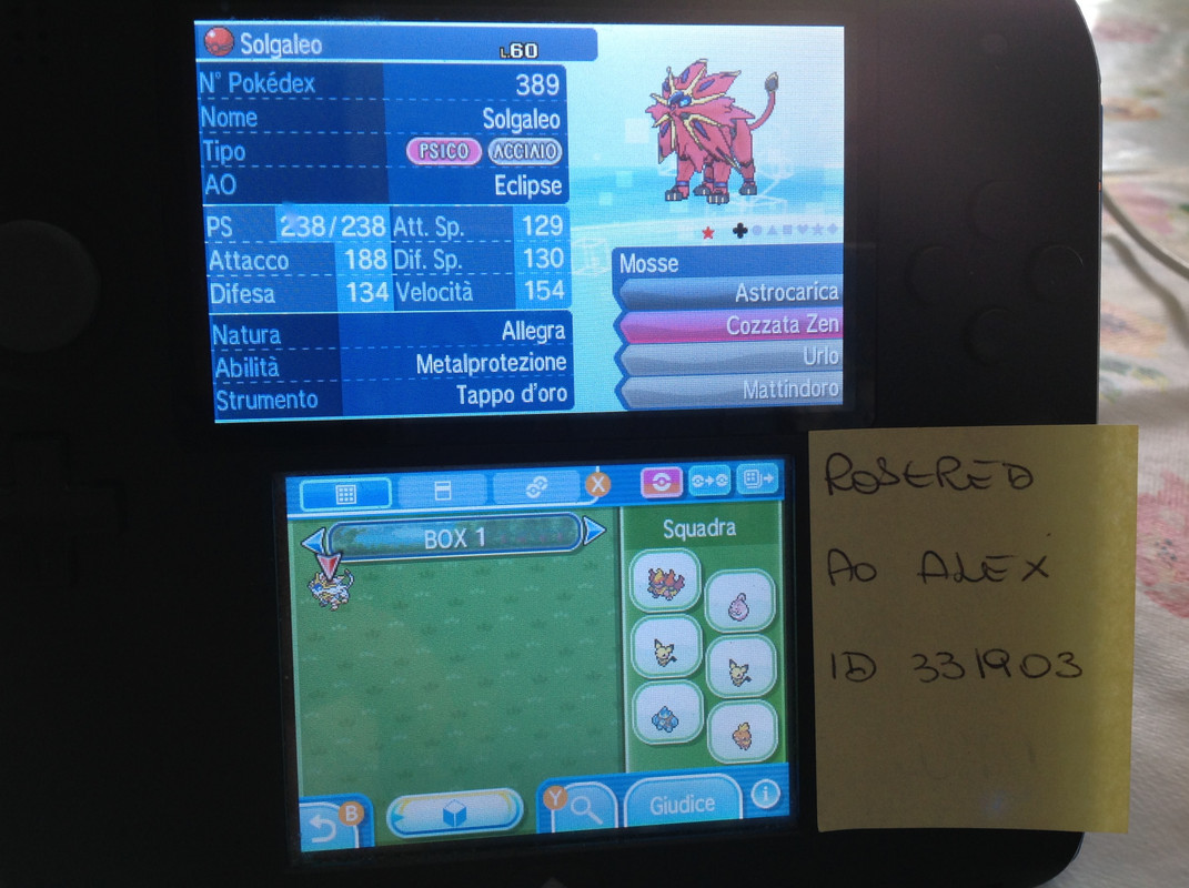 RoseRed Inviato 22 gennaio, 2020 Inviato 22 gennaio, 2020 (modificato) I pokemon evento qui presenti, riscattati da me, non potranno essere rivenduti in nessun mercatino, asta o privatamente! Sono frutto di innumerevoli softreset per offrire non solo eventi in quanto tali, ma eventi con nature e statistiche il quanto più ottimali ( cosa molto difficile per i pokemon vintage per i quali non c'era la regola di minimo 3 statistiche al 31)! Tutti gli eventi sono stati clonati con il backup del salvataggio e potranno essere scambiati su USUM e/o SwoShi e/o Perla e Diamante! Elencate qui ciò che vi interessa e poi mandatemi un messaggio... Non scambio su HOME Tutti gli starter dei precedenti giochi sono stati da me breedati in aprimons, dandogli egg moves. L'AO sarà RoseRed 333858. Avranno tutti 5 ivs come da loro natura. Sesso e Abilità saranno random e il teratipo corrisponderà al loro tipo. Costo 0.15 pp cadauno, per più richieste si effettueranno sconti. Costo scarti 0.07 pp. Spoiler -Bulbasaur dream ball /modest (Capocciata-Tossina-Maledizione-Radicamento) -Charmander level ball/timid (Forzantica-Dragofuria-Codacciaio-Panciamburo) -Squirtle lure ball/careful (Specchiovelo-Nebbia-Bruciapelo-Acquagetto) -Chikorita friend ball/calm (Forzantica-Frustata-Curapulsar-Contrattacco) -Cyndaquil level ball/timid (Extrasenso-Doppiocalcio-Supplica-Maledizione) -Totodile lure ball/jolly (Forzantica-Contrattacco-Acquagetto-Blocco) -Treecko friend ball/timid (Nottesferza-Lacerazione-Dragospiro-Doppiocalcio) -Torchic level ball/adamant (Nottesferza-Beccata-Contrattacco-Tritartigli) -Mudkip lure ball/jolly (Fango-Morso-Pestone-Specchiovelo) -Turtwig friend ball/jolly (Colpo-Affannoseme-Troppoforte-Bodyguard -Chimchar dream ball/timid (Contrattacco-Bruciapelo) -Piplup moon ball/calm (Sbadiglio-Trespolo-Tracotanza-Acquanello) -Snivy friend ball/timid (Codacciaio-Sintesi-Tornado-Specchiovelo) -Tepig level ball/jolly (Colpo-Sbadiglio-Sbigoattacco-Troppoforte) -Oshawott lure ball/modest (Eterelama-Idrotaglio-Nottesferza-Spadasolenne) -Chespin friend ball/bold (Superzanna-Maledizione-Panciamburo-Sintesi) -Fennekin rapid ball/timid (Copione-Desiderio-Ipnosi-Magicozona) -Rowlet safari ball/jolly (Scacciabruma-Trespolo-Privazione-Stordiraggio) -Litten level ball/adamant (Bruciapelo-Monito-Tracotanza) -Popplio moon ball/modest (Acquanello-Goccia Vitale-Ultimocanto) -Grookey friend ball/jolly (Bruciapelo-Martelpugno-Parassiseme-Forza) -Scorbunny rapid ball/jolly (Calcinvolo-Sbigoattacco-Superzanna-Turbosabbia) -Sobble moon ball/timid (Acquagetto-Pungiglione-Geloscheggia-Doppioteam) Jirachi Cromatico Tanabata costo 3.00 pp -Jirachi Tanabata Cromatico Liv. 10/AO たなばた/ID 08014/Leggiadro/Timido/x-31-x-31-31-x/Pregio ball/Desiderio/Comete/Curardore/Forza Lunare/Provenienza Kalos/data ottenimento agosto 2014/Dynamax 0 Rayquaza Cromatico Evento costo 3.00 pp -Rayquaza Cromatico Liv. 70/AO Galileo/ID 08055/Riparo/Audace/31-x-31-31-x-x/Pregio ball/Dragartigli/Extrarapido/Dragodanza/Ascesa del Drago/Provenienza Hoenn/data ottenimento settembre 2015/Dynamax 0 Tapu Fini Cromatico Evento costo 2.50 pp -Tapu Fini Cromatico Liv. 60/AO Poni/ID 190524/Nebbiogenesi/Calma/31-31-x-31-x-x/Pregio ball/Ira della Natura/Fanghiglia/Acquanello/Idropompa/Provenienza Alola/data ottenimento luglio 2019/Dynamax 0 Tapu Koko Cromatico Evento costo 2.50 pp -Tapu Koko Cromatico Liv. 60/AO MeleMele/ID 170714/Elettrogenesi/Timido/31-x-x-31-x-31/Pregio ball/Ira della Natura/Scarica/Agilità/Energisfera/Provenienza Alola/data ottenimento agosto 2017/Dynamax 0 Zygarde Cromatico Evento costo 2.50 pp - Zygarde Cromatico Liv. 60/AO Leggende2018/ID 060218/Frangiaura/Scaltro/31-x-31-31-x-x/Pregio ball/Forza Tellurica/Sguardo Feroce/Salvaguardia/Dragospiro/Provenienza Luogo Grazioso/data ottenimento giugno 2018/Dynamax 0 Spoiler Silvally Cromatico Evento costo 2.50 pp -Silvally Cromatico Liv. 100/AO Aether/ID 102317/Primevo/Timido/31-x-x-31-x-31/Pregio ball/Multiattacco/Monito/Visotruce/Provenienza Alola/data ottenimento Novembre 2017/Dynamax 0 Spoiler Poipole Cromatico Evento costo 2.50 pp - Poipole Cromatico Liv. 40/AO Ultra/ID 091718/Ultraboost/Modesto/30-31-x-31-x-31/Pregio ball/Velenotrappola/Congiura/Velenpuntura/Dragopulsar/Provenienza Luogo Grazioso/data ottenimento Ottobre 2018/Dynamax 0 Spoiler https://i.postimg.cc/PqsJBRCb/IMG-1722.jpg https://i.postimg.cc/kG4gQrHC/IMG-1751.jpg https://i.postimg.cc/7YjZ2Wnv/IMG-1752.jpg Mewtwo Cromatico Evento costo 3.00 pp - Mewtwo Cromatico Liv.100/AO Play!2016/ID 07266/Agitazione/Timido/31-x-x-31-31-31/Pregio ball/Psicobotta/Psichico/Ripresa/Forzasfera/Provenienza Kalos/data ottenimento agosto 2016/Dynamax 0 Spoiler Solgaleo Cromatico Evento costo 2.50 pp -Solgaleo Cromatico Liv.60/AO Eclipse/ID 100419/Metalprotezione/Allegro/x-31-x-x-31-31/Pregio ball/Astrocarica/Cozzata Zen/Urlo/Mattindoro/Provenienza Alola/data ottenimento novembre 2019/Dynamax 0 Spoiler https://i.postimg.cc/fbzpC4mH/IMG-1757.jpg https://i.postimg.cc/c1pzjtft/IMG-1758.jpg https://i.postimg.cc/6pwm6sj9/IMG-1765.jpg https://i.postimg.cc/rwJYKh35/IMG-1766.jpg Lunala Cromatico Evento costo 2.50 pp -Lunala Cromatico Liv.60/AO Eclipse/ID 100419/Spettroguardia/Ingenuo/31-x-x-31-x-31/Pregio ball/Raggio d'Ombra/Psicoshock/Forza Lunare/Lucelunare/Provenienza Alola/data ottenimento novembre 2019/Dynamax 0 Spoiler https://i.postimg.cc/28CVf7pp/IMG-1753.jpg https://i.postimg.cc/brpNppB0/IMG-1755.jpg https://i.postimg.cc/FFVHGkYT/IMG-1756.jpg https://i.postimg.cc/V6RP9MKM/IMG-1761.jpg Charizard Cromatico Evento costo 2.50 pp -Charizard Cromatico Liv.36/AO PRIMAVERA15/ID 04015/Aiutofuoco/Timido/30-x-x-x-x-31/Pregio ball/Vampata/Solarraggio/Focalcolpo/Mano nella Mano/Provenienza Kalos/data ottenimento maggio 2015/Dynamax 0 Spoiler Gengar Cromatico Evento costo 2.50 pp -Gengar Cromatico Liv.25/AO OTTOBRE14/ID 10134/Corpofunesto/Modesto/31-x-x-31-x-x/Scuro ball/Palla Ombra/Fangonda/Stordiraggio/Sgomento/Provenienza Kalos/data ottenimento ottobre 20