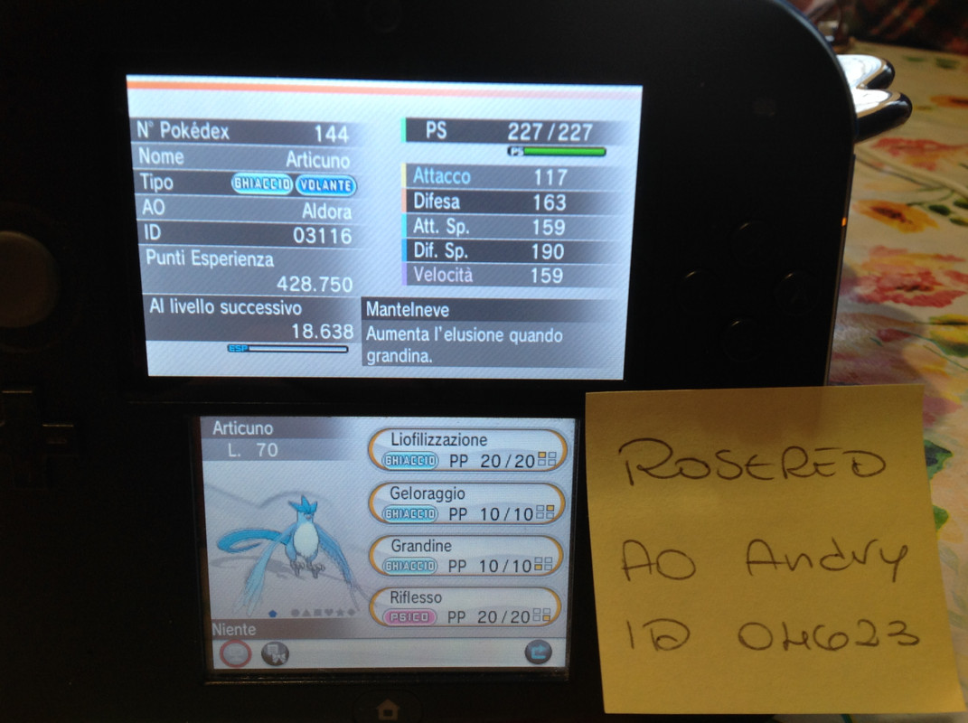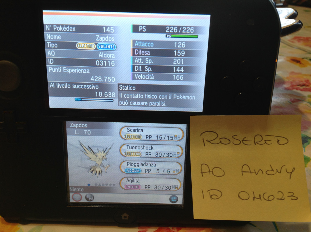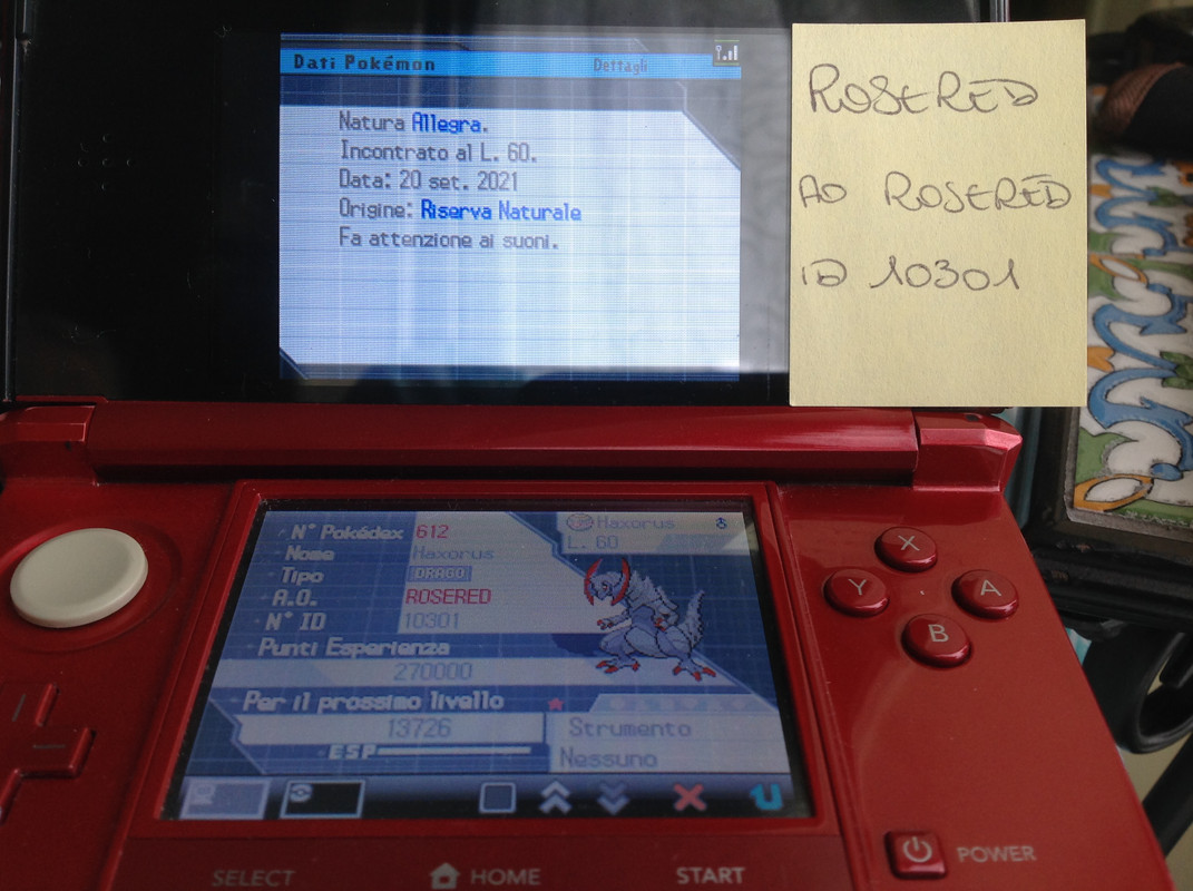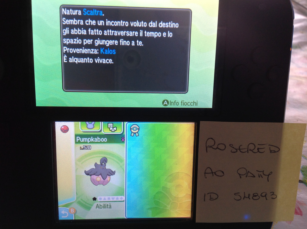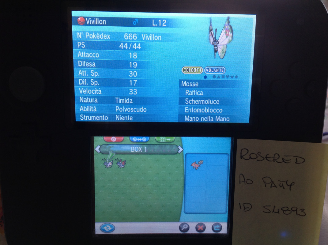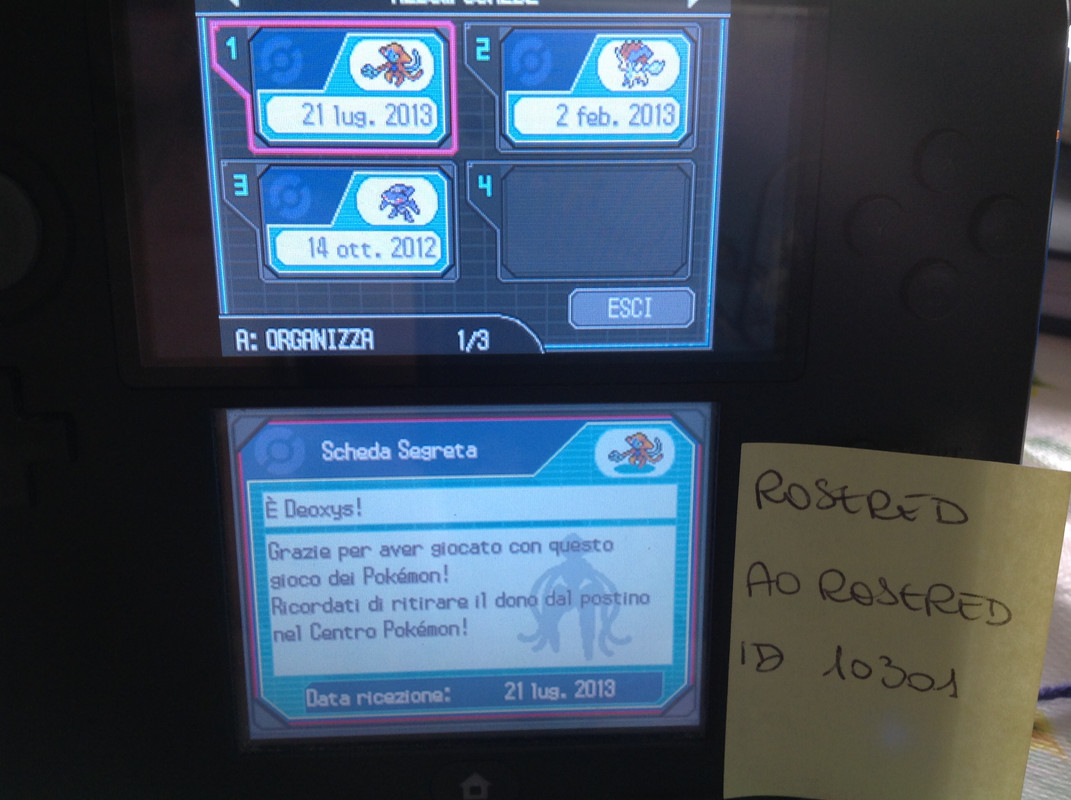 RoseRed Inviato 22 gennaio, 2020 Inviato 22 gennaio, 2020 (modificato) I pokemon evento qui presenti, riscattati da me, non potranno essere rivenduti in nessun mercatino, asta o privatamente! Sono frutto di innumerevoli softreset per offrire non solo eventi in quanto tali, ma eventi con nature e statistiche il quanto più ottimali ( cosa molto difficile per i pokemon vintage per i quali non c'era la regola di minimo 3 statistiche al 31)! Tutti gli eventi sono stati clonati con il backup del salvataggio e potranno essere scambiati su USUM e/o SwoShi e/o Perla e Diamante! Elencate qui ciò che vi interessa e poi mandatemi un messaggio... Non scambio su HOME Tutti gli starter dei precedenti giochi sono stati da me breedati in aprimons, dandogli egg moves. L'AO sarà RoseRed 333858. Avranno tutti 5 ivs come da loro natura. Sesso e Abilità saranno random e il teratipo corrisponderà al loro tipo. Costo 0.15 pp cadauno, per più richieste si effettueranno sconti. Costo scarti 0.07 pp. Spoiler -Bulbasaur dream ball /modest (Capocciata-Tossina-Maledizione-Radicamento) -Charmander level ball/timid (Forzantica-Dragofuria-Codacciaio-Panciamburo) -Squirtle lure ball/careful (Specchiovelo-Nebbia-Bruciapelo-Acquagetto) -Chikorita friend ball/calm (Forzantica-Frustata-Curapulsar-Contrattacco) -Cyndaquil level ball/timid (Extrasenso-Doppiocalcio-Supplica-Maledizione) -Totodile lure ball/jolly (Forzantica-Contrattacco-Acquagetto-Blocco) -Treecko friend ball/timid (Nottesferza-Lacerazione-Dragospiro-Doppiocalcio) -Torchic level ball/adamant (Nottesferza-Beccata-Contrattacco-Tritartigli) -Mudkip lure ball/jolly (Fango-Morso-Pestone-Specchiovelo) -Turtwig friend ball/jolly (Colpo-Affannoseme-Troppoforte-Bodyguard -Chimchar dream ball/timid (Contrattacco-Bruciapelo) -Piplup moon ball/calm (Sbadiglio-Trespolo-Tracotanza-Acquanello) -Snivy friend ball/timid (Codacciaio-Sintesi-Tornado-Specchiovelo) -Tepig level ball/jolly (Colpo-Sbadiglio-Sbigoattacco-Troppoforte) -Oshawott lure ball/modest (Eterelama-Idrotaglio-Nottesferza-Spadasolenne) -Chespin friend ball/bold (Superzanna-Maledizione-Panciamburo-Sintesi) -Fennekin rapid ball/timid (Copione-Desiderio-Ipnosi-Magicozona) -Rowlet safari ball/jolly (Scacciabruma-Trespolo-Privazione-Stordiraggio) -Litten level ball/adamant (Bruciapelo-Monito-Tracotanza) -Popplio moon ball/modest (Acquanello-Goccia Vitale-Ultimocanto) -Grookey friend ball/jolly (Bruciapelo-Martelpugno-Parassiseme-Forza) -Scorbunny rapid ball/jolly (Calcinvolo-Sbigoattacco-Superzanna-Turbosabbia) -Sobble moon ball/timid (Acquagetto-Pungiglione-Geloscheggia-Doppioteam) Jirachi Cromatico Tanabata costo 3.00 pp -Jirachi Tanabata Cromatico Liv. 10/AO たなばた/ID 08014/Leggiadro/Timido/x-31-x-31-31-x/Pregio ball/Desiderio/Comete/Curardore/Forza Lunare/Provenienza Kalos/data ottenimento agosto 2014/Dynamax 0 Rayquaza Cromatico Evento costo 3.00 pp -Rayquaza Cromatico Liv. 70/AO Galileo/ID 08055/Riparo/Audace/31-x-31-31-x-x/Pregio ball/Dragartigli/Extrarapido/Dragodanza/Ascesa del Drago/Provenienza Hoenn/data ottenimento settembre 2015/Dynamax 0 Tapu Fini Cromatico Evento costo 2.50 pp -Tapu Fini Cromatico Liv. 60/AO Poni/ID 190524/Nebbiogenesi/Calma/31-31-x-31-x-x/Pregio ball/Ira della Natura/Fanghiglia/Acquanello/Idropompa/Provenienza Alola/data ottenimento luglio 2019/Dynamax 0 Tapu Koko Cromatico Evento costo 2.50 pp -Tapu Koko Cromatico Liv. 60/AO MeleMele/ID 170714/Elettrogenesi/Timido/31-x-x-31-x-31/Pregio ball/Ira della Natura/Scarica/Agilità/Energisfera/Provenienza Alola/data ottenimento agosto 2017/Dynamax 0 Zygarde Cromatico Evento costo 2.50 pp - Zygarde Cromatico Liv. 60/AO Leggende2018/ID 060218/Frangiaura/Scaltro/31-x-31-31-x-x/Pregio ball/Forza Tellurica/Sguardo Feroce/Salvaguardia/Dragospiro/Provenienza Luogo Grazioso/data ottenimento giugno 2018/Dynamax 0 Spoiler Silvally Cromatico Evento costo 2.50 pp -Silvally Cromatico Liv. 100/AO Aether/ID 102317/Primevo/Timido/31-x-x-31-x-31/Pregio ball/Multiattacco/Monito/Visotruce/Provenienza Alola/data ottenimento Novembre 2017/Dynamax 0 Spoiler Poipole Cromatico Evento costo 2.50 pp - Poipole Cromatico Liv. 40/AO Ultra/ID 091718/Ultraboost/Modesto/30-31-x-31-x-31/Pregio ball/Velenotrappola/Congiura/Velenpuntura/Dragopulsar/Provenienza Luogo Grazioso/data ottenimento Ottobre 2018/Dynamax 0 Spoiler https://i.postimg.cc/PqsJBRCb/IMG-1722.jpg https://i.postimg.cc/kG4gQrHC/IMG-1751.jpg https://i.postimg.cc/7YjZ2Wnv/IMG-1752.jpg Mewtwo Cromatico Evento costo 3.00 pp - Mewtwo Cromatico Liv.100/AO Play!2016/ID 07266/Agitazione/Timido/31-x-x-31-31-31/Pregio ball/Psicobotta/Psichico/Ripresa/Forzasfera/Provenienza Kalos/data ottenimento agosto 2016/Dynamax 0 Spoiler Solgaleo Cromatico Evento costo 2.50 pp -Solgaleo Cromatico Liv.60/AO Eclipse/ID 100419/Metalprotezione/Allegro/x-31-x-x-31-31/Pregio ball/Astrocarica/Cozzata Zen/Urlo/Mattindoro/Provenienza Alola/data ottenimento novembre 2019/Dynamax 0 Spoiler https://i.postimg.cc/fbzpC4mH/IMG-1757.jpg https://i.postimg.cc/c1pzjtft/IMG-1758.jpg https://i.postimg.cc/6pwm6sj9/IMG-1765.jpg https://i.postimg.cc/rwJYKh35/IMG-1766.jpg Lunala Cromatico Evento costo 2.50 pp -Lunala Cromatico Liv.60/AO Eclipse/ID 100419/Spettroguardia/Ingenuo/31-x-x-31-x-31/Pregio ball/Raggio d'Ombra/Psicoshock/Forza Lunare/Lucelunare/Provenienza Alola/data ottenimento novembre 2019/Dynamax 0 Spoiler https://i.postimg.cc/28CVf7pp/IMG-1753.jpg https://i.postimg.cc/brpNppB0/IMG-1755.jpg https://i.postimg.cc/FFVHGkYT/IMG-1756.jpg https://i.postimg.cc/V6RP9MKM/IMG-1761.jpg Charizard Cromatico Evento costo 2.50 pp -Charizard Cromatico Liv.36/AO PRIMAVERA15/ID 04015/Aiutofuoco/Timido/30-x-x-x-x-31/Pregio ball/Vampata/Solarraggio/Focalcolpo/Mano nella Mano/Provenienza Kalos/data ottenimento maggio 2015/Dynamax 0 Spoiler Gengar Cromatico Evento costo 2.50 pp -Gengar Cromatico Liv.25/AO OTTOBRE14/ID 10134/Corpofunesto/Modesto/31-x-x-31-x-x/Scuro ball/Palla Ombra/Fangonda/Stordiraggio/Sgomento/Provenienza Kalos/data ottenimento ottobre 20