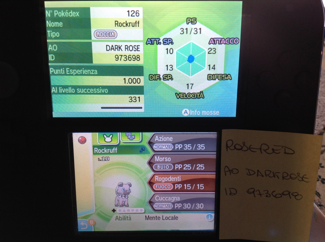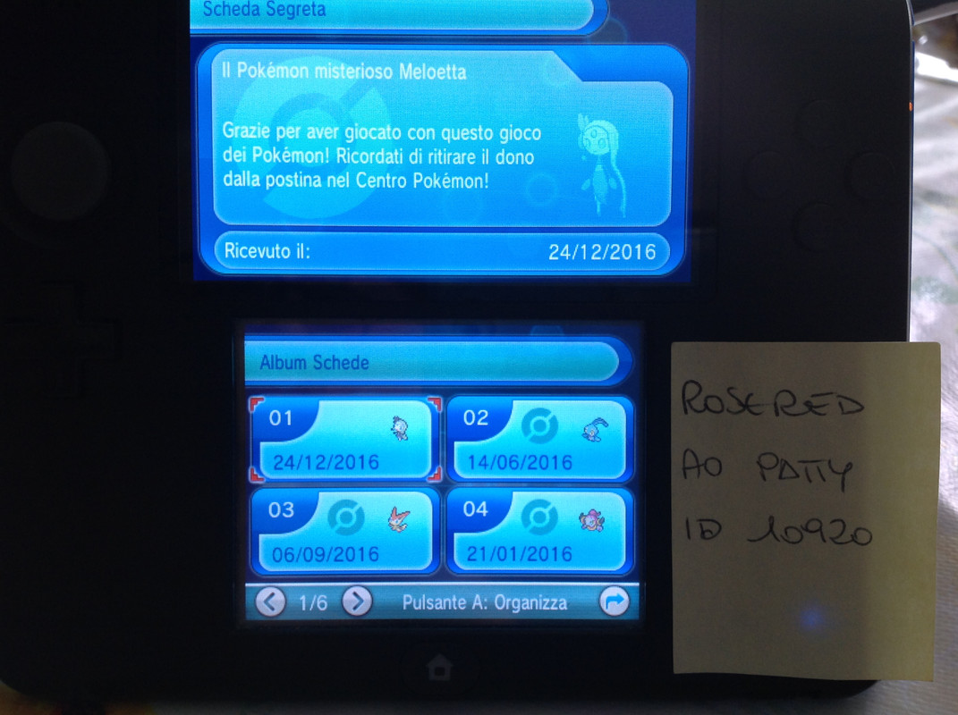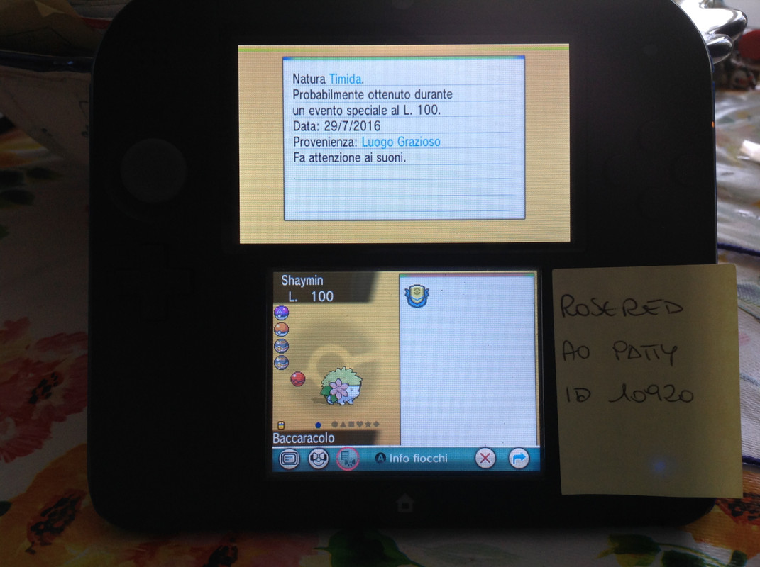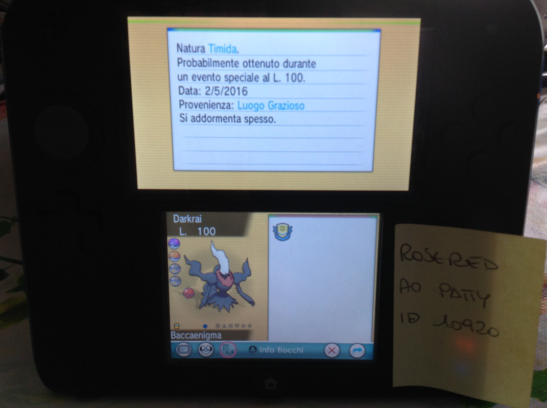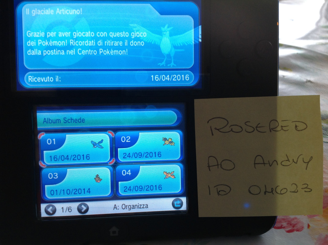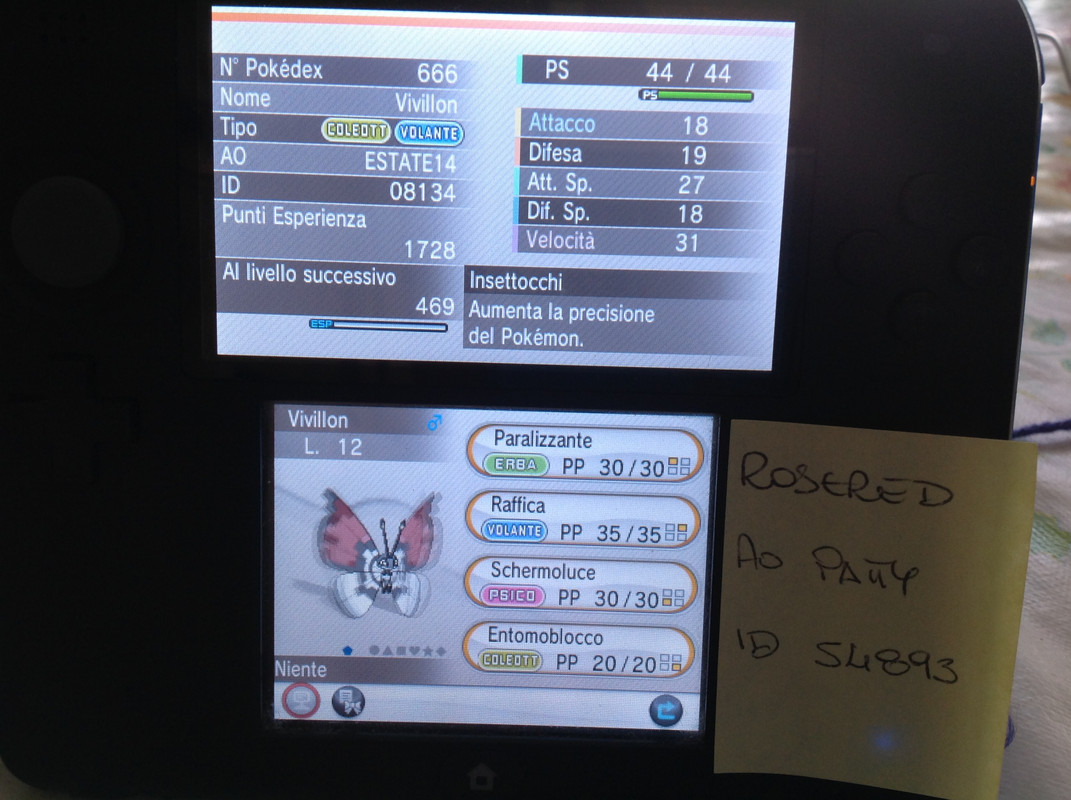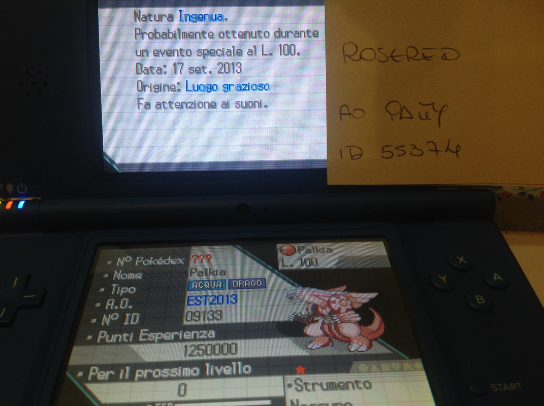RoseRed Inviato 22 gennaio, 2020 Inviato 22 gennaio, 2020 (modificato) I pokemon evento qui presenti, riscattati da me, non potranno essere rivenduti in nessun mercatino, asta o privatamente! Sono frutto di innumerevoli softreset per offrire non solo eventi in quanto tali, ma eventi con nature e statistiche il quanto più ottimali ( cosa molto difficile per i pokemon vintage per i quali non c'era la regola di minimo 3 statistiche al 31)! Tutti gli eventi sono stati clonati con il backup del salvataggio e potranno essere scambiati su USUM e/o SwoShi e/o Perla e Diamante! Elencate qui ciò che vi interessa e poi mandatemi un messaggio... Non scambio su HOME Tutti gli starter dei precedenti giochi sono stati da me breedati in aprimons, dandogli egg moves. L'AO sarà RoseRed 333858. Avranno tutti 5 ivs come da loro natura. Sesso e Abilità saranno random e il teratipo corrisponderà al loro tipo. Costo 0.15 pp cadauno, per più richieste si effettueranno sconti. Costo scarti 0.07 pp. Spoiler -Bulbasaur dream ball /modest (Capocciata-Tossina-Maledizione-Radicamento) -Charmander level ball/timid (Forzantica-Dragofuria-Codacciaio-Panciamburo) -Squirtle lure ball/careful (Specchiovelo-Nebbia-Bruciapelo-Acquagetto) -Chikorita friend ball/calm (Forzantica-Frustata-Curapulsar-Contrattacco) -Cyndaquil level ball/timid (Extrasenso-Doppiocalcio-Supplica-Maledizione) -Totodile lure ball/jolly (Forzantica-Contrattacco-Acquagetto-Blocco) -Treecko friend ball/timid (Nottesferza-Lacerazione-Dragospiro-Doppiocalcio) -Torchic level ball/adamant (Nottesferza-Beccata-Contrattacco-Tritartigli) -Mudkip lure ball/jolly (Fango-Morso-Pestone-Specchiovelo) -Turtwig friend ball/jolly (Colpo-Affannoseme-Troppoforte-Bodyguard -Chimchar dream ball/timid (Contrattacco-Bruciapelo) -Piplup moon ball/calm (Sbadiglio-Trespolo-Tracotanza-Acquanello) -Snivy friend ball/timid (Codacciaio-Sintesi-Tornado-Specchiovelo) -Tepig level ball/jolly (Colpo-Sbadiglio-Sbigoattacco-Troppoforte) -Oshawott lure ball/modest (Eterelama-Idrotaglio-Nottesferza-Spadasolenne) -Chespin friend ball/bold (Superzanna-Maledizione-Panciamburo-Sintesi) -Fennekin rapid ball/timid (Copione-Desiderio-Ipnosi-Magicozona) -Rowlet safari ball/jolly (Scacciabruma-Trespolo-Privazione-Stordiraggio) -Litten level ball/adamant (Bruciapelo-Monito-Tracotanza) -Popplio moon ball/modest (Acquanello-Goccia Vitale-Ultimocanto) -Grookey friend ball/jolly (Bruciapelo-Martelpugno-Parassiseme-Forza) -Scorbunny rapid ball/jolly (Calcinvolo-Sbigoattacco-Superzanna-Turbosabbia) -Sobble moon ball/timid (Acquagetto-Pungiglione-Geloscheggia-Doppioteam) Jirachi Cromatico Tanabata costo 3.00 pp -Jirachi Tanabata Cromatico Liv. 10/AO たなばた/ID 08014/Leggiadro/Timido/x-31-x-31-31-x/Pregio ball/Desiderio/Comete/Curardore/Forza Lunare/Provenienza Kalos/data ottenimento agosto 2014/Dynamax 0 Rayquaza Cromatico Evento costo 3.00 pp -Rayquaza Cromatico Liv. 70/AO Galileo/ID 08055/Riparo/Audace/31-x-31-31-x-x/Pregio ball/Dragartigli/Extrarapido/Dragodanza/Ascesa del Drago/Provenienza Hoenn/data ottenimento settembre 2015/Dynamax 0 Tapu Fini Cromatico Evento costo 2.50 pp -Tapu Fini Cromatico Liv. 60/AO Poni/ID 190524/Nebbiogenesi/Calma/31-31-x-31-x-x/Pregio ball/Ira della Natura/Fanghiglia/Acquanello/Idropompa/Provenienza Alola/data ottenimento luglio 2019/Dynamax 0 Tapu Koko Cromatico Evento costo 2.50 pp -Tapu Koko Cromatico Liv. 60/AO MeleMele/ID 170714/Elettrogenesi/Timido/31-x-x-31-x-31/Pregio ball/Ira della Natura/Scarica/Agilità/Energisfera/Provenienza Alola/data ottenimento agosto 2017/Dynamax 0 Zygarde Cromatico Evento costo 2.50 pp - Zygarde Cromatico Liv. 60/AO Leggende2018/ID 060218/Frangiaura/Scaltro/31-x-31-31-x-x/Pregio ball/Forza Tellurica/Sguardo Feroce/Salvaguardia/Dragospiro/Provenienza Luogo Grazioso/data ottenimento giugno 2018/Dynamax 0 Spoiler Silvally Cromatico Evento costo 2.50 pp -Silvally Cromatico Liv. 100/AO Aether/ID 102317/Primevo/Timido/31-x-x-31-x-31/Pregio ball/Multiattacco/Monito/Visotruce/Provenienza Alola/data ottenimento Novembre 2017/Dynamax 0 Spoiler Poipole Cromatico Evento costo 2.50 pp - Poipole Cromatico Liv. 40/AO Ultra/ID 091718/Ultraboost/Modesto/30-31-x-31-x-31/Pregio ball/Velenotrappola/Congiura/Velenpuntura/Dragopulsar/Provenienza Luogo Grazioso/data ottenimento Ottobre 2018/Dynamax 0 Spoiler https://i.postimg.cc/PqsJBRCb/IMG-1722.jpg https://i.postimg.cc/kG4gQrHC/IMG-1751.jpg https://i.postimg.cc/7YjZ2Wnv/IMG-1752.jpg Mewtwo Cromatico Evento costo 3.00 pp - Mewtwo Cromatico Liv.100/AO Play!2016/ID 07266/Agitazione/Timido/31-x-x-31-31-31/Pregio ball/Psicobotta/Psichico/Ripresa/Forzasfera/Provenienza Kalos/data ottenimento agosto 2016/Dynamax 0 Spoiler Solgaleo Cromatico Evento costo 2.50 pp -Solgaleo Cromatico Liv.60/AO Eclipse/ID 100419/Metalprotezione/Allegro/x-31-x-x-31-31/Pregio ball/Astrocarica/Cozzata Zen/Urlo/Mattindoro/Provenienza Alola/data ottenimento novembre 2019/Dynamax 0 Spoiler https://i.postimg.cc/fbzpC4mH/IMG-1757.jpg https://i.postimg.cc/c1pzjtft/IMG-1758.jpg https://i.postimg.cc/6pwm6sj9/IMG-1765.jpg https://i.postimg.cc/rwJYKh35/IMG-1766.jpg Lunala Cromatico Evento costo 2.50 pp -Lunala Cromatico Liv.60/AO Eclipse/ID 100419/Spettroguardia/Ingenuo/31-x-x-31-x-31/Pregio ball/Raggio d'Ombra/Psicoshock/Forza Lunare/Lucelunare/Provenienza Alola/data ottenimento novembre 2019/Dynamax 0 Spoiler https://i.postimg.cc/28CVf7pp/IMG-1753.jpg https://i.postimg.cc/brpNppB0/IMG-1755.jpg https://i.postimg.cc/FFVHGkYT/IMG-1756.jpg https://i.postimg.cc/V6RP9MKM/IMG-1761.jpg Charizard Cromatico Evento costo 2.50 pp -Charizard Cromatico Liv.36/AO PRIMAVERA15/ID 04015/Aiutofuoco/Timido/30-x-x-x-x-31/Pregio ball/Vampata/Solarraggio/Focalcolpo/Mano nella Mano/Provenienza Kalos/data ottenimento maggio 2015/Dynamax 0 Spoiler Gengar Cromatico Evento costo 2.50 pp -Gengar Cromatico Liv.25/AO OTTOBRE14/ID 10134/Corpofunesto/Modesto/31-x-x-31-x-x/Scuro ball/Palla Ombra/Fangonda/Stordiraggio/Sgomento/Provenienza Kalos/data ottenimento ottobre 20