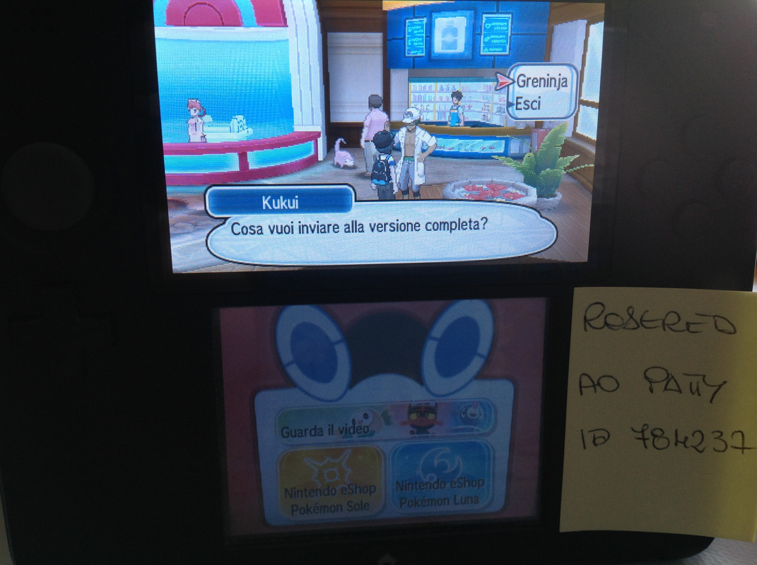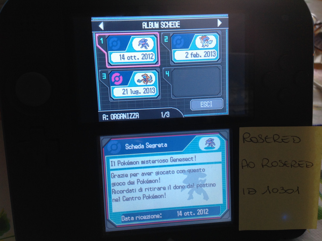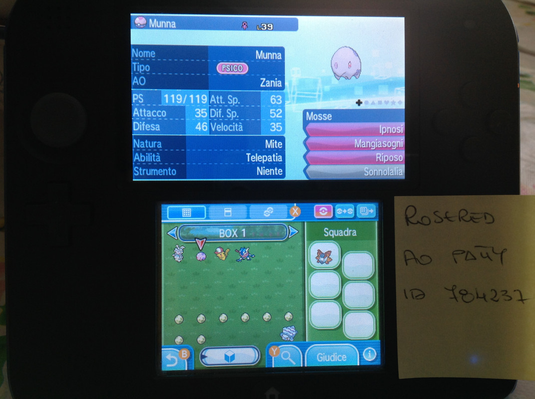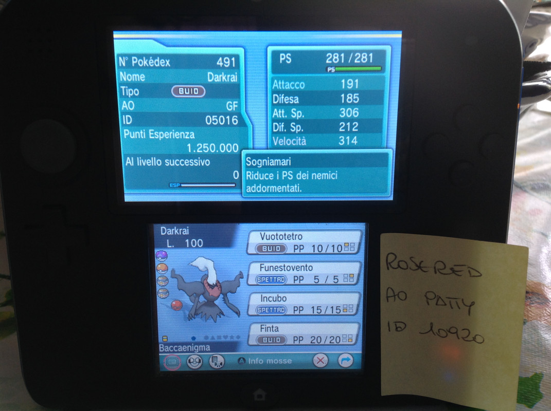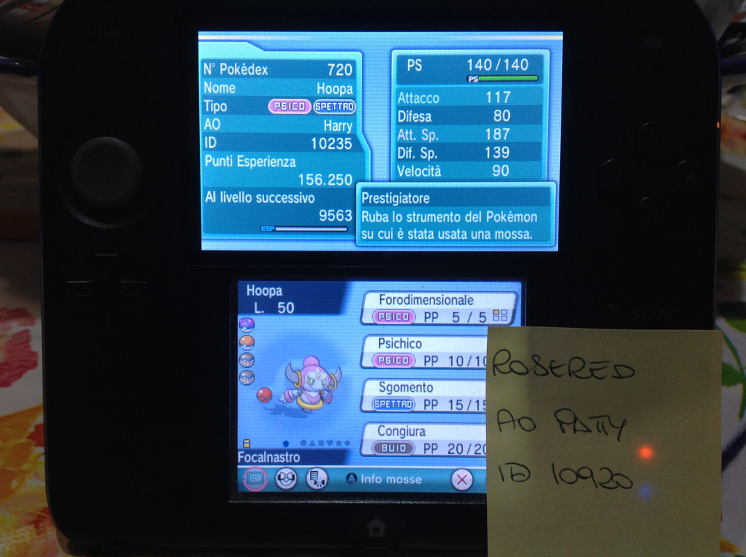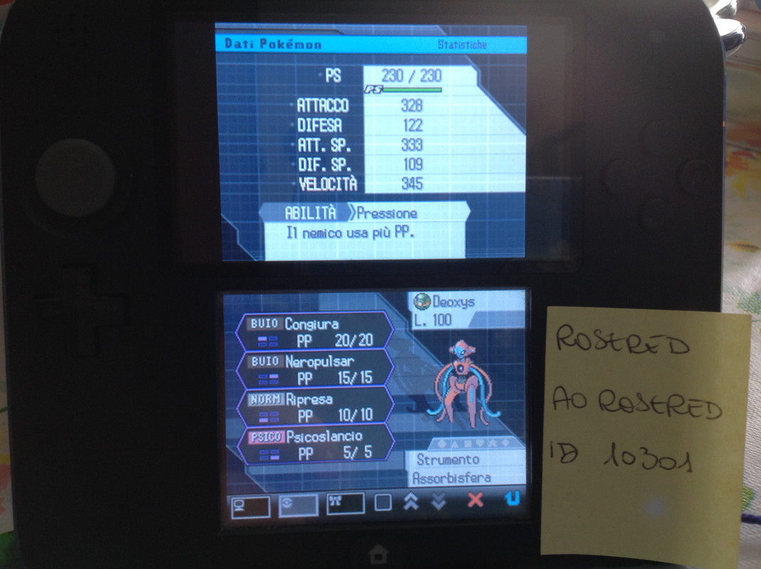 RoseRed Inviato 22 gennaio, 2020 Inviato 22 gennaio, 2020 (modificato) I pokemon evento qui presenti, riscattati da me, non potranno essere rivenduti in nessun mercatino, asta o privatamente! Sono frutto di innumerevoli softreset per offrire non solo eventi in quanto tali, ma eventi con nature e statistiche il quanto più ottimali ( cosa molto difficile per i pokemon vintage per i quali non c'era la regola di minimo 3 statistiche al 31)! Tutti gli eventi sono stati clonati con il backup del salvataggio e potranno essere scambiati su USUM e/o SwoShi e/o Perla e Diamante! Elencate qui ciò che vi interessa e poi mandatemi un messaggio... Non scambio su HOME Tutti gli starter dei precedenti giochi sono stati da me breedati in aprimons, dandogli egg moves. L'AO sarà RoseRed 333858. Avranno tutti 5 ivs come da loro natura. Sesso e Abilità saranno random e il teratipo corrisponderà al loro tipo. Costo 0.15 pp cadauno, per più richieste si effettueranno sconti. Costo scarti 0.07 pp. Spoiler -Bulbasaur dream ball /modest (Capocciata-Tossina-Maledizione-Radicamento) -Charmander level ball/timid (Forzantica-Dragofuria-Codacciaio-Panciamburo) -Squirtle lure ball/careful (Specchiovelo-Nebbia-Bruciapelo-Acquagetto) -Chikorita friend ball/calm (Forzantica-Frustata-Curapulsar-Contrattacco) -Cyndaquil level ball/timid (Extrasenso-Doppiocalcio-Supplica-Maledizione) -Totodile lure ball/jolly (Forzantica-Contrattacco-Acquagetto-Blocco) -Treecko friend ball/timid (Nottesferza-Lacerazione-Dragospiro-Doppiocalcio) -Torchic level ball/adamant (Nottesferza-Beccata-Contrattacco-Tritartigli) -Mudkip lure ball/jolly (Fango-Morso-Pestone-Specchiovelo) -Turtwig friend ball/jolly (Colpo-Affannoseme-Troppoforte-Bodyguard -Chimchar dream ball/timid (Contrattacco-Bruciapelo) -Piplup moon ball/calm (Sbadiglio-Trespolo-Tracotanza-Acquanello) -Snivy friend ball/timid (Codacciaio-Sintesi-Tornado-Specchiovelo) -Tepig level ball/jolly (Colpo-Sbadiglio-Sbigoattacco-Troppoforte) -Oshawott lure ball/modest (Eterelama-Idrotaglio-Nottesferza-Spadasolenne) -Chespin friend ball/bold (Superzanna-Maledizione-Panciamburo-Sintesi) -Fennekin rapid ball/timid (Copione-Desiderio-Ipnosi-Magicozona) -Rowlet safari ball/jolly (Scacciabruma-Trespolo-Privazione-Stordiraggio) -Litten level ball/adamant (Bruciapelo-Monito-Tracotanza) -Popplio moon ball/modest (Acquanello-Goccia Vitale-Ultimocanto) -Grookey friend ball/jolly (Bruciapelo-Martelpugno-Parassiseme-Forza) -Scorbunny rapid ball/jolly (Calcinvolo-Sbigoattacco-Superzanna-Turbosabbia) -Sobble moon ball/timid (Acquagetto-Pungiglione-Geloscheggia-Doppioteam) Jirachi Cromatico Tanabata costo 3.00 pp -Jirachi Tanabata Cromatico Liv. 10/AO たなばた/ID 08014/Leggiadro/Timido/x-31-x-31-31-x/Pregio ball/Desiderio/Comete/Curardore/Forza Lunare/Provenienza Kalos/data ottenimento agosto 2014/Dynamax 0 Rayquaza Cromatico Evento costo 3.00 pp -Rayquaza Cromatico Liv. 70/AO Galileo/ID 08055/Riparo/Audace/31-x-31-31-x-x/Pregio ball/Dragartigli/Extrarapido/Dragodanza/Ascesa del Drago/Provenienza Hoenn/data ottenimento settembre 2015/Dynamax 0 Tapu Fini Cromatico Evento costo 2.50 pp -Tapu Fini Cromatico Liv. 60/AO Poni/ID 190524/Nebbiogenesi/Calma/31-31-x-31-x-x/Pregio ball/Ira della Natura/Fanghiglia/Acquanello/Idropompa/Provenienza Alola/data ottenimento luglio 2019/Dynamax 0 Tapu Koko Cromatico Evento costo 2.50 pp -Tapu Koko Cromatico Liv. 60/AO MeleMele/ID 170714/Elettrogenesi/Timido/31-x-x-31-x-31/Pregio ball/Ira della Natura/Scarica/Agilità/Energisfera/Provenienza Alola/data ottenimento agosto 2017/Dynamax 0 Zygarde Cromatico Evento costo 2.50 pp - Zygarde Cromatico Liv. 60/AO Leggende2018/ID 060218/Frangiaura/Scaltro/31-x-31-31-x-x/Pregio ball/Forza Tellurica/Sguardo Feroce/Salvaguardia/Dragospiro/Provenienza Luogo Grazioso/data ottenimento giugno 2018/Dynamax 0 Spoiler Silvally Cromatico Evento costo 2.50 pp -Silvally Cromatico Liv. 100/AO Aether/ID 102317/Primevo/Timido/31-x-x-31-x-31/Pregio ball/Multiattacco/Monito/Visotruce/Provenienza Alola/data ottenimento Novembre 2017/Dynamax 0 Spoiler Poipole Cromatico Evento costo 2.50 pp - Poipole Cromatico Liv. 40/AO Ultra/ID 091718/Ultraboost/Modesto/30-31-x-31-x-31/Pregio ball/Velenotrappola/Congiura/Velenpuntura/Dragopulsar/Provenienza Luogo Grazioso/data ottenimento Ottobre 2018/Dynamax 0 Spoiler https://i.postimg.cc/PqsJBRCb/IMG-1722.jpg https://i.postimg.cc/kG4gQrHC/IMG-1751.jpg https://i.postimg.cc/7YjZ2Wnv/IMG-1752.jpg Mewtwo Cromatico Evento costo 3.00 pp - Mewtwo Cromatico Liv.100/AO Play!2016/ID 07266/Agitazione/Timido/31-x-x-31-31-31/Pregio ball/Psicobotta/Psichico/Ripresa/Forzasfera/Provenienza Kalos/data ottenimento agosto 2016/Dynamax 0 Spoiler Solgaleo Cromatico Evento costo 2.50 pp -Solgaleo Cromatico Liv.60/AO Eclipse/ID 100419/Metalprotezione/Allegro/x-31-x-x-31-31/Pregio ball/Astrocarica/Cozzata Zen/Urlo/Mattindoro/Provenienza Alola/data ottenimento novembre 2019/Dynamax 0 Spoiler https://i.postimg.cc/fbzpC4mH/IMG-1757.jpg https://i.postimg.cc/c1pzjtft/IMG-1758.jpg https://i.postimg.cc/6pwm6sj9/IMG-1765.jpg https://i.postimg.cc/rwJYKh35/IMG-1766.jpg Lunala Cromatico Evento costo 2.50 pp -Lunala Cromatico Liv.60/AO Eclipse/ID 100419/Spettroguardia/Ingenuo/31-x-x-31-x-31/Pregio ball/Raggio d'Ombra/Psicoshock/Forza Lunare/Lucelunare/Provenienza Alola/data ottenimento novembre 2019/Dynamax 0 Spoiler https://i.postimg.cc/28CVf7pp/IMG-1753.jpg https://i.postimg.cc/brpNppB0/IMG-1755.jpg https://i.postimg.cc/FFVHGkYT/IMG-1756.jpg https://i.postimg.cc/V6RP9MKM/IMG-1761.jpg Charizard Cromatico Evento costo 2.50 pp -Charizard Cromatico Liv.36/AO PRIMAVERA15/ID 04015/Aiutofuoco/Timido/30-x-x-x-x-31/Pregio ball/Vampata/Solarraggio/Focalcolpo/Mano nella Mano/Provenienza Kalos/data ottenimento maggio 2015/Dynamax 0 Spoiler Gengar Cromatico Evento costo 2.50 pp -Gengar Cromatico Liv.25/AO OTTOBRE14/ID 10134/Corpofunesto/Modesto/31-x-x-31-x-x/Scuro ball/Palla Ombra/Fangonda/Stordiraggio/Sgomento/Provenienza Kalos/data ottenimento ottobre 20