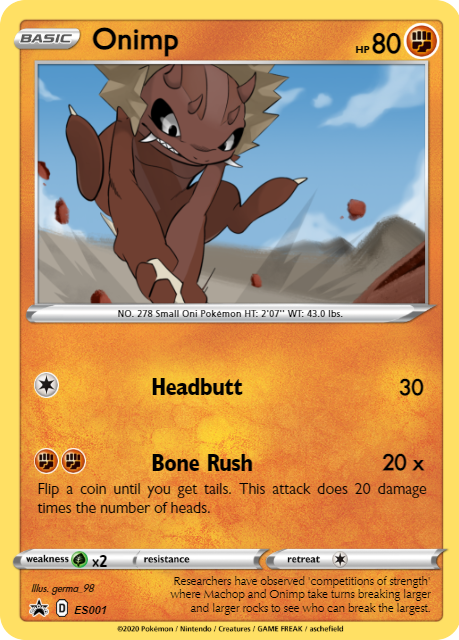 Marco9 Inviato 10 gennaio, 2022 Inviato 10 gennaio, 2022 15 ore fa, TheWorld98 ha scritto: Una carta che ho ideato sulla base di un fakemon di una famosa pagina IG. Ho provato anche ad accennare uno sfondo, ma il risultato è alquanto... desolante... Nascondi contenuto Apri contenuto nascosto La creatura originale Apri contenuto nascosto Inoltre visto che sei molto bravo,vorrei consigliarti dell'evoluzione. Prima però devo darti alcune motivazioni dei nomi. Secondo i Giapponesi esistono due tipi di oni, quello rosso (Aka-oni) e quello blu (Ao-oni) entrambi servitori del grande re demone (Enma Dai Oh). Inoltre gli oni sono simili agli orchi occidentali Sapendo questo farei così. -Aonirc (dall'unione delle parole Ao+oni+orco) di tipo ghiaccio/lotta. -Akanirc ( dall'unione di Aka+oni+orco) di tipo fuoco/lotta. Sapendo che Ao-oni è quello blu,farei si che Onimp si evolve in Aonirc usando una pietragelo. Poi sapendo che Aka-oni è quello rosso, farei evolvere Onimp in Akanirc usando una pietrafocaia. Poi farei un'altra evoluzione. -Endeki(dall'unione di Enma+demon+king) di tipo Buio/lotta Sapendo che Enma è il re dei demoni e che i due oni sono i sui servitori,farei in modo che Onimp si evolva in Endeki di notte, quando sale di livello avendo in squadra Aonirc e Akanirc. Ora sta a te, se ti è piaciuta la mia idea, disegnarli.