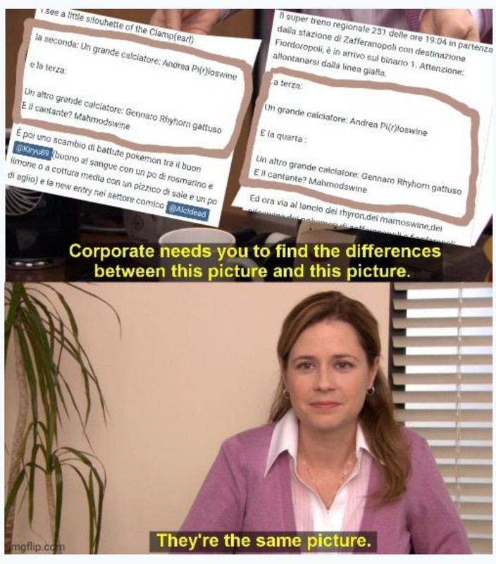 Woolcloud Inviato 4 gennaio, 2023 Inviato 4 gennaio, 2023 1 ora fa, evilespeon ha scritto: allora gente oggi si va vanti col racconto di bastonate a @Kiryu89 ESPI E LE SUE AVVENTURE A PALDEA parte 4 season 2 Nascondi contenuto Allora ci eravamo fermati che stavamo andando a los tezones città artistica per battere il capoplaestra /artista avangiardista brassius Sulla strada per andare in the città battiamo ancora qualche poke il che causa la evo del cugino di woolcloud in cugino di woolcloud più rosa Arriviamo in città e già dall'ingresso notiamo alcuni prpblemi di fondo in quest'ordine : Statue di sunflora depressi un mulino che va più scatti dei miei bervi quando kiryu fa battute...o della mia connessione a scelta Un labirinto di erba facilmente evitabile saltandoci sopra con la moto e un po troppo infiammabile Una specie di parco giochi in legno...altrettanto infiammabile Tutto ci porta ad una conclusione...speriamo di non beccare kiryu qui o se lo torciamo daremo fuoco a mezza città Manco io tempo di oensare questo che entrando nell'edificio delle palestre chi ci becchiamo? Kiryu ovvio Lei ci tiene a specificare che non ci sta seguendo.....nooooooo..... ma si sta solo esercitando coi suoi poke e le sue battute e infatti ce ne spara uan così senza manco avvisare : i panettieri sono grandi appassionati di serie tv ma guardano solo la versione integrale Stiamo per cuocere kiryu in verisone integrale anche quando ci chiama l'addetto agli esami delle palestre...dobbiamo fare il nostro esame o meglio non dobbiamo farlo noi Ikachu teratopo volante realizza chi dovrà fare l'esame @Alemat cerca di consolare pikachu dicendo che la prpva potrebbe essere semplice come questo suo meme Ma in realtà si tratta di beccare 10 sunflora che sono scappati per tutta la città perché brassius faceva statue di loro depressi Pikachu cerca di farsi forza ricordando ce anche a l pikachu di ash era tccato sto esame...più o meno E studia un piano per prendere tutti i sunflora Piano di pikachu: piazzare @Kiryu89, @TheMirko96 e @Quasar nei tre punti strategici della città e dargli un megafono poi fargli dire battute Mentre pika organizza tutto facciamo un giro per la city e incontriamo @Celes @Sonichu @Diamaxus e @YukiV che guardano una scultura di un sunflora depresso : "sunflora arreso" dice il titolo Parte la discussione artistica su a cosa si sia arreso Yuki ipotezza che sia una rappresentazione di un sunflora che ha rubato qualcosa in caffetteria e si è arreso a lei e la sua tinkaton che lo hanno beccato e bastonato Diamaxus ipotezza che si sia arreso alle battute di kiryu...lo capirebbe XD Sonichu e celes invece vedono un altra scultura della city e dicono che gli sembra un po kiryu bruciacchiato dopo le torce Intanto pikachu ha finito il suo piano e fa iniziare subito kiryu a dire una battuta col megafono Kiryu dice : cosa dicd un boyscout quando finisce in una brutta situazione? Al cam-peggio non c'è mai fine @Sonichu dice a kiryu ce ora gli mostra lui come accedevao il fuoco al campeggio Alcuni sunflora sentono lo scoppio e scappano tutti dietro a pikachu per diendersi implorandolo di riportarlj a casa ...e 5 sunflora sono beccati Ora è il turno di mirko con la sua battuta al megafono e dice: ma se tolgo le batterie ad un telecomando lo depilo? A lui stavolta ci pensa celes Un altro sunflora scappa via spaventatissimo da pikachu Comunque celes e sonichu avevano ragione ,i due comici bruciacchiati sembrano proprio oper d'arte della città Un altro sunflora viene travolto da qualcosa che rotola...o meglio qualcuno XD è @Woolcloud con espi che la segue facendo domande su nicola...sbalzano via il sunflora che torna direttamente a casa stile team rocket e siamo a 7 sunflora presi E il turno di @Quasarche al megafono dice una delle sue battute classiche....battute sui nomi tedeschi dei poke : ComCome Si chiama il più famoso scenziato del mondo poke? Albert kleinstein Pure pikachu è confuso stavolta Ma quas ci spiega che kleinstein è geodude in tedesco Stavola sono direttamente i sunflora a torciarlo e visto che sono gialli usano una sua creazione: E poi se ne tornano da soli a casa,se fuori dalla città c'è sra gente meglio non scappare A loro si unisce yuki con un facepalm che posto' negli antichi fasti del manualepalm...che potete trovare sempre qui nel covo 0 Questi erano gli utimi 3 sunflora Pikachu ce la ha fatta e li ha riportati a casa tutti e 10 anche se si è beccato tante torce e bruciature da esplosioni so a fine esame lo vediamo così Ma per pika non è ancora finita,visto che brassius è gym leader erba e lui è tera topo volante ci sarà molto utile in lotta più ci paralizza la gente e ci serve come sacrificio per curare gli altri poke in lotta...so gli tocca faticare ancora Quando pika capisce non è ancora finita reagisce così Ma noi gli diciamo ce se non lotta prende bastonate Bastonate di espi o lotta? Pikachu kanco deve pensarci Eccolo pronto a lottare contro brassius Andiamo verso il mulino a scatti per iniziare la lotta To be continued -> pronti a torciare gente? E a bastonare? Il prossimo racconto sarà lunedì perché vado un pochino in pausa per feste Lunedì avremo la lotta con brassius e l'inizio della ricerca dell'altro dominante assieme a @Sonichu ma ci saranno anche altri di voi poi vedrete come Stay tuned Taggo un po di people @YukiV @Celes @TheMirko96 @evil_gina @Alemat @Diamaxus @GameGate01@Woolcloud @Sonichu @M0viz @MoonlightUmbreon @Quasa @Kiryu89 @Quasar TORCEEEEEEEEEEEEEEEEEE Spoiler Io>>>>>>>>