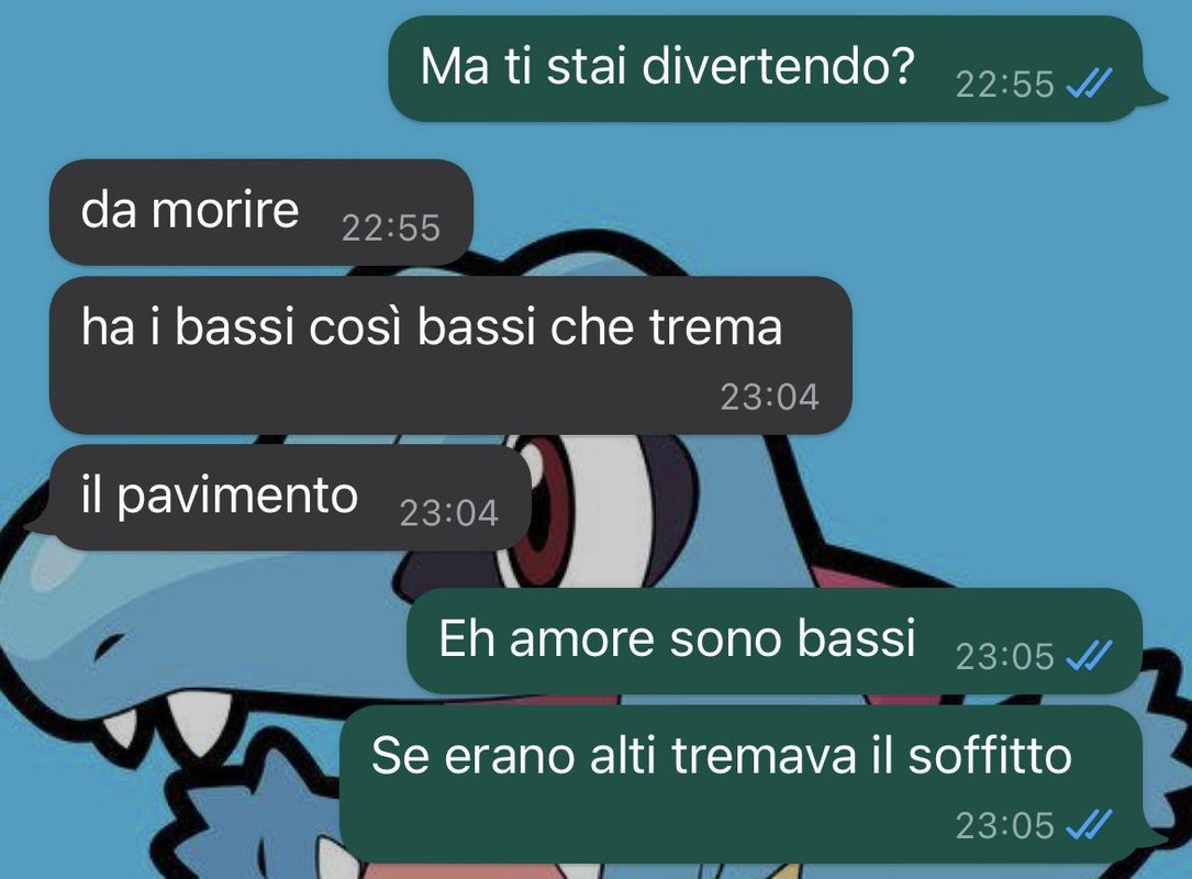 Sonichu Inviato 9 gennaio, 2023 Inviato 9 gennaio, 2023 1 ora fa, evilespeon ha scritto: Quasar: è nella wish list di tutti Mirko: si come il formaggio Quasar: il for-gennaio vorrai dire ,maggio è passato (Dialogo realmente accaduto in sala torce) 1 ora fa, evilespeon ha scritto: Sonichu ovvio ci aspettava così Il mio mood quando mi hanno comunicato che devo fare recupero di Matematica 1 ora fa, evilespeon ha scritto: Ci sono due maiali,uno dice all'altro "aspeckami un attimo" e l'altro "ma quando torni?" "Tranquillo torno tra porco" @Sonichu non ce la fa più impazzisce ed è pronto a far esplodere tutto...lo giriamo nella direzione dei massi e ce li elimina lui così L'ho detto che le esplosioni risolvono tutto! Se vi dico che ho sempre creduto che la bacheca personale fosse la firma TwT... https://pokepast.es/c65d1c0d47115fdf https://pokepast.es/337db2c5f7052447 https://pokepast.es/33a51aa9a7da3c56 https://pokepast.es/350be1dd844ac401 https://pokepast.es/eb3836997891b7f2 https://pokepast.es/127b44ef3af4ff4e qualcuno dei miei miglior team,tracui una mono veleno per faccia di glitter @Icarus Tutti i Pokemon che utilizzo sul forum in caso GDR (non so più che inventarmi per riempire un po il mio profilo) x 3000 x 1500 x 1500 x 1000 x 2000 x 3500 x 1000 Team Blue Spoiler -Idrobreccia -Terremoto -Gelopugno -Oltraggio -Psicoshock -Magibrillio -Ripresa -Energipalla -Forzasfera -Dragopulsar -Cannonflash -Raggio d'Acciaio -Gelolancia -Sanguisuga -Breccia -Metaltestata -Sgranocchio -Colpo Infernale -Protezione -Desiderio -Aeroblast -Forzantica -Extrasenso -Ripresa