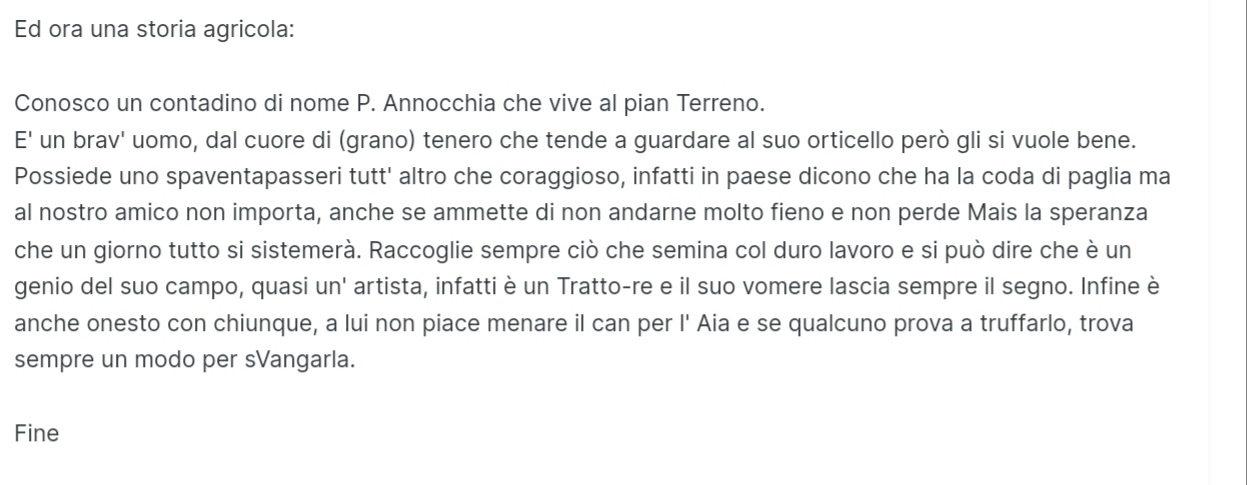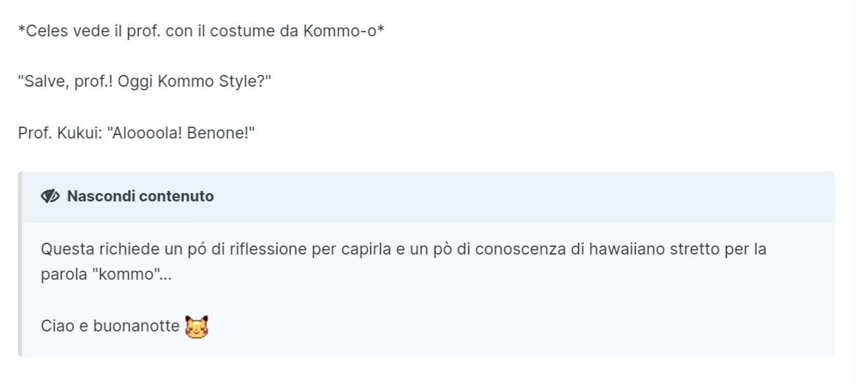 Celes Inviato 31 gennaio, 2023 Inviato 31 gennaio, 2023 On 30/1/2023 at 19:31, evilespeon ha scritto: Allora gente sta per iniziare il new racconto di bastonate al @Kiryu89 State pronti Nascondi contenuto Allora eravamo arrivati dhe avevamo battuto algaro Prendiamo il woolcloud taxi e ci dirigiamo subito verso la new base 0 più vicina che si trova nel boschetto colorato dei grafaiai...un bosco che faremo saltare in aria mi sa XD Garoff ci corre incontro dal bosco ma @Woolcloud non può fermarsi,deve arrivare a destinazi8ne sennò niente tariffa intera so mette sotto il povero garoff e un paio di alberi del boschetto Da dentro il pelo di woolcloud garoff ci dice che ha riflettuto su molte cose e sta capendo cose sugli star e che se affrontiamo la new base vorrebbe parlare anche col nuovo capo Gli diciamo che va bene ma solo se paga anche lui per il viaggio in @Woolcloud taxi Intanto un ragazzino ci si para davanti...ma woolcloud mette sotto anche lui Da dentro la lana di woolcloud ci dice che si chiama gaetano e che è il nobile henzo è come un fratello per lui so vuole entrare nella base star...poi dice che siccome siamo nemici del nobile henzo vuole lottare @Woolcloud allora si ferma,le lotte nel suo pelo costano un extra che non ci possiamo permettere so scendiamo e lottiamo col ragazzino Ma prima @Kiryu89 fa la sua classica battuta di inizio lotta: ho litigato con un calzolaio,mi ha minacciato dicendomi che mi farà le scarpe Il ragazzino rimane sconvolto dalla battuta ma lancia comunque il suo primo pokemon,gulpin un paiodi colpi di gatito più alto prestigiatore e va giù Il ragazzino manda in campo il suo ultimo poke,bomboletta spray venuta male anche nota come pre evo di grafaiai Battiamo anche lui con du graffiate poi cerchiamo di entrare nella base star ma il cancello è chiuso Dal profondo del boschetto sentiamo un urlo e vediamo due occhi rossi spaventosi Chi sarà? Kiss...ah no kissara l'abbiamo già passata XD è @Sonichu che ha sentito la battuta di kiryu e ora deve distruggere qualcosa Perfetto gli facciamo buttare giù il cancello della base star Dietro al cancello c'erano 3 membri star so manco il tempo di entrare e già ci leviamo 3 membri dal conteggio dei 30 da battere Entriamo nella base e kiryu dice subito a sua battuta d'ingresso: Ma se compongo una poesia di sole parolacce posso dire di aver composto in stile volgare? Celes che passava di lì lo sente e forse per lo shock forse per l'aria di paldea che non fa tanto bene anche lei si unisce e siccome sta arrivando il estival di Sanremo si sente in dovere di ricordarlo al team star con una battuta musicale Tre membri star sono così sconvolti dalla battuta che decidono di lasciare la via dello star ,tornare all'accademia e seguire tutti i corsi sulle torce disponibili Intanto @TheMirko96 vede che pure celes fa battute oggi...può restarne fuori lui? Ovvio che no quindi dice: Goodespeon è andata a Chiasso,le ho chiesto che ci faceva li e lei mi ha detto che li può fare sempre festa tanto c'è chiasso @Quasar sente la battuta geografica su chiasso e non si lascia scappare l'occasione per alcune delle sue battute geografiche con goodespeon preferite:Goodespeon ha fatto un giro d'Italia e mi ha detto alcune cose: - Potenza è molto forte - Trapani molto rumorosa - a Brindisi si beve molto -Si è fermata un attimo a fermo Tre membri star capiscono che più che questa agonia meglio tornare all'accademia a studoare geografia...senza Goodespeon possibilmente @Alemat intanto vede che in questo ep sono tutti comici e si ricorda dei bei tempi della sala torce quando di comici ce ne erano solo due e poteva fare questo meme con @Kiryu89 e @Alcidead ora sono tutti comici e non può più fare meme easy,la cosa lo fa piangere Uno degli star dice una cosa come "ma perché quel topo piange?" Alemat lo sente e si ricorda che in oltre qui espi gli fa fare il topo...e piange a dirotto Tre membri star lo portano via dalla base per consolarlo e comprargli un gelato...e per scappare dalle prossime battute @Celes intanto ormai è partita a ruota libera con le battute musicali e dice: @Diamaxus decide che è meglio fermarla prima che si penta di quanto sta dicendo...e che nel mentre può levarci di mezzo anche qualche star E lancia la sua nuova arma elettrica non plus ultra Doppia potenza di torcia con sia fiamma classica che fiamma elettrca per gli amanti sia della tradizione che della modernità Due membri star si pigliano l'acendino tecnologico in testa e vanno dall'infermiera joy wntre il terzo chiede a diamaxus dove ha comprato l'arma...e va ad acquistarne una per lui ,fa molto elegante Intanto kiryu non vuole che celes gli ruba gli spalti e dice : Dopo questa combo di battute 8 membri star decidono che non sono pagati abbastanza per stare lì ad ascoltare ste cose...non sono pagati proprio XD so se ne vanno via Intanto @Sonichu ha sentito tutte queste battute e si lancia velocemente cotro @Kiryu89 così Poi guarda @Kiryu89 così Kiryu allora fa per ripretere le battute ma no riesce manco ad inizare che @Sonichu Lo mira col bazooka...kiryu scappa ma il colpo è così potente che fa esplodere mezza base star e brucacchia kiryu per bene @Franzini passa di li coi suoi raichu indiani... Che stavano in una casa vicino a fare i pigri XD gli dice di portare via kiryu...forse vuole rivenderlo a torciatori sul mercato nero...chi lo sa come funziona la mafia di pikachu indiani Mentre kiryu viene portato via ci ritroviamo nel bel mezzo della base star bruciacchiata Vediamo @YukiV che ne approfitta per cuocere il pesce comprato a marinada e write spiedini di pesce per tutti dopo....tutto molto bello ma come ci scappiamo dalla base in fiamme Dall'alto sentiamo un grido e @Woolcloud viene in nostro soccorso dall'alto come solo un eroe taxi che vuole la tariffa per i viaggi in mezzo al fuoco sa fare Afferra al volo me,yuki,celes,diamaxus e sonichu e poke di kiryu rimasti e scappiamo tutti verso la macchina di henzo...l'unica cosa che per ora non h
