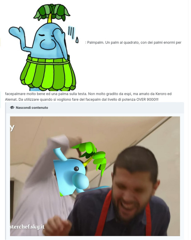 Sonichu Inviato 2 febbraio, 2023 Inviato 2 febbraio, 2023 23 ore fa, evilespeon ha scritto: Sei tu la debellatrice di reclute vile fellona? Ma come parla sto qui? @Kiryu89 però vuole dimostrare che lui sa dire molto peggio e dice: Ok. Oooook. Sono MOLTO calmo! Vedi?: 23 ore fa, evilespeon ha scritto: Mentre henzo sta per lanciare il suo secondo pokemon percepiamo qualcosa tipo così Qualcuno ci osserva o meglio osserva @Kiryu89 Sono TROPPO calmo! 23 ore fa, evilespeon ha scritto: Il secondo poke del nobile henzo cioè pozza di melma nota come muk percepisce il pericolo in arrivo,sbatte la testa contro l'auto star e si leva ps da solo fino a tornare in salvo nella pokeball Intanto parte l'urlo Kiryuuuuuuuuuuu! L'urlp rimbomba per mezza base star *l'urlo arriva fino ad Unima. Anemome e Silvestro iniziano a scampare nel bunker anti-bastonate* 23 ore fa, evilespeon ha scritto: @Woolcloud capisce che sta per succedere qualcosa di brutto e ha fatto troppi soldi per perderli in una esplosione so segue il manuale del woolcloud taxi che in caso di pericolo dice: Approvo in pieno! 23 ore fa, evilespeon ha scritto: Intanto @Celes che ormai sta in uno stato confusionale causato da tutto il rotolare dice: Io con @Celes 23 ore fa, evilespeon ha scritto: Di lui se ne occupa sempre soldato ceruleo con due colpi di furtivombra ...ormai il motore sta per crollare gli sono rimasti pochi ps ma arrivano @TheMirko96 e @Quasar con la loro mossa combobattute su evilespeon e goodespeon Vi prego no... 23 ore fa, evilespeon ha scritto: @Sonichu sente questa combo terrificante e tira fuori l'artiglieria pesante ALL'ATTACCO! *un armata di Meganium col bazooka parte all'attacco* 23 ore fa, evilespeon ha scritto: Franzini chiede ai raichudi preparare pancakes gratis per tutti CIBO! *lascia qualsiasi intendo omicida e inizia a mangiare* 23 ore fa, evilespeon ha scritto: Dopo la mangiata decidiamo di recarci assieme a @Sonichu verso la zona del next dominante in @Woolcloud taxi che intanto si è ripresa coi pancake gratis e il pensiero di un altro viaggio pagato da farci fare @Woolcloud mi fai lo sconto che tanto mi porti in gita? Se vi dico che ho sempre creduto che la bacheca personale fosse la firma TwT... https://pokepast.es/c65d1c0d47115fdf https://pokepast.es/337db2c5f7052447 https://pokepast.es/33a51aa9a7da3c56 https://pokepast.es/350be1dd844ac401 https://pokepast.es/eb3836997891b7f2 https://pokepast.es/127b44ef3af4ff4e qualcuno dei miei miglior team,tracui una mono veleno per faccia di glitter @Icarus Tutti i Pokemon che utilizzo sul forum in caso GDR (non so più che inventarmi per riempire un po il mio profilo) x 3000 x 1500 x 1500 x 1000 x 2000 x 3500 x 1000 Team Blue Spoiler -Idrobreccia -Terremoto -Gelopugno -Oltraggio -Psicoshock -Magibrillio -Ripresa -Energipalla -Forzasfera -Dragopulsar -Cannonflash -Raggio d'Acciaio -Gelolancia -Sanguisuga -Breccia -Metaltestata -Sgranocchio -Colpo Infernale -Protezione -Desiderio -Aeroblast -Forzantica -Extrasenso -Ripresa