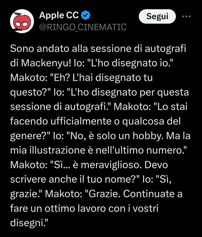 evilespeon Inviato 15 aprile Inviato 15 aprile 49 minuti fa, Celes ha scritto: Pure l'AI lo sa quant'è bello lui Comunque è uscito un video di un altro attore, stavolta di Mr. 5. Se volete vederlo, eccolo qua: Nascondi contenuto @Diamaxus questo segnatelo pure che è un altro villain ancora @evilespeon poi ho visto un repost di questa fanart qua molto bella, con Zoro anime e Zoro live-action La particolarità è che è autografata da Mackenyu. L'artista infatti nella descrizione riporta tutto il dialogo con lui al momento dell'autografo: Nascondi contenuto La traduzione: A parte Google Translate che ha tradotto dopo "Mackenyu" in "Makoto", la traduzione si capisce XD Bellissimo farsi autografare un proprio disegno di Zoro da Zoro real in persona che ti fa pure i complimenti, GG all'artista Grandissimooo l'artista e anche molto coraggioso a farsi autografare l'opera,si deve essere sempre fieri di che si disegna E grandissimoooo anche il nostro zoro real che ha fatto l'autografo e ha incitato pure gli artisti Ma per tutto il dialogo io ero: e moh chi è sto makoto? Mi sono persa qualcosa?XD E' stata aggiunta una reazione da Celes 1 TEAM 0 RULES...J0IN THE P0KECLUB TEAM 0 UNIC0 PREMIO VINTO IN UN GDR FIN ORA...DOVEVO RIMETTERLO XD espon gif by @SlowHandBoy0...ditemi perche si chiama cosi please XD @Alemat è mio rivale e mi frega i pikachu ma ora è contento che è stato citato XD ragalino by @Porygatto (visitate la sua gallery) quanto carino pikachu che imita lotad Sprite by @Vale (visitate la sua gallery) Doll fantastiche fatte da my rival giallo @Alemat espeon compleanno espeon compleanno animata espeon di natale Espeon di natale is finally real XD elfilin super cute from kirby and the forgotten land by @Alemat doll ufficiale (anche se il rival dice di no XD) del mio disegno riolu kart by @Alemat eevee che evolve in espi by my rival @Alemat Evilespeon bossa team0 version gdr (versione icon) by @Silvercenturion Evilespeon bossa team 0 version gdr (versione sprite) by @Silvercenturion il trio politico (io, @Alemat e @Quasar) è qui Sprite by @Alemat tatsugiri di zeria by @Macca zeria e repubblica gialla sushide version,ci vogliamo bene in realtà siamo aleati u.u Lo sguardo sospetto succede solo alcune volte XD quello di repubblica guarda con sospetto lo zeriano per capire che combina coi pikachu e quello zeriano guarda con sospetto quello di repubblica gialla per capire se gli ha fregato dei pikachu per liberarli XD E comunque quello è uno sguardo d'affetto u.u sprite sempre by @Macca il trio politico e togeticplz in posa,sprite by rival giallo @Alemat