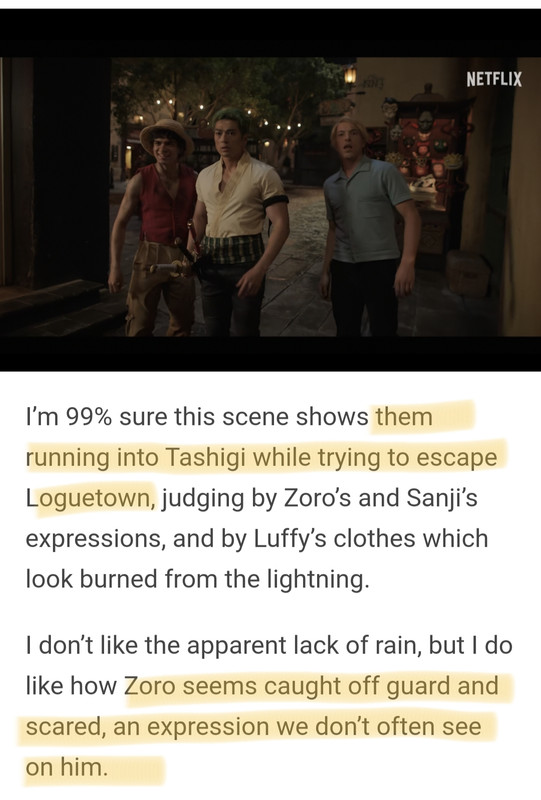Diamaxus Inviato 23 settembre Inviato 23 settembre 30 minuti fa, Celes ha scritto: Da un blog su Tumblr dedicato a Zoro e Tashigi: Nascondi contenuto Ho evidenziato queste parti qua XD Esattamente quello che pensavo anch'io XD Zoro ha un'espressione insolita, non è da lui XD E questo perché evidentemente avrà incontrato Tashigi mentre lui e gli altri stanno scappando da Loguetown Secondo me, come dice pure questo blog, è quella parte lí della storia, ovvero prima che Zoro e Tashigi fanno il loro duello. Poi ovviamente se ci sarà una scena cosí, non ci resterà che attendere La scena: Nascondi contenuto Comunque sia, vorrei che questa parte post-duello coincida con la mia sceneggiatura immaginaria, col vis a vis che si compie con il bacio in the rain XDD (Ma visto che pretendo troppo XD, mi va benone anche la romantic tension con i loro sguardi u.u ) XDD @evilespeon @Diamaxus Potrebbe essere Lo spero troppo E' stata aggiunta una reazione da Celes 1 "A ogni nuovo incontro segue sempre un addio. Tuttavia non è detto che debba essere per sempre... Starà a te deciderne la durata..." ~L'allegro venditore di maschere (TLOZ: Majora's Mask) Art Gallery