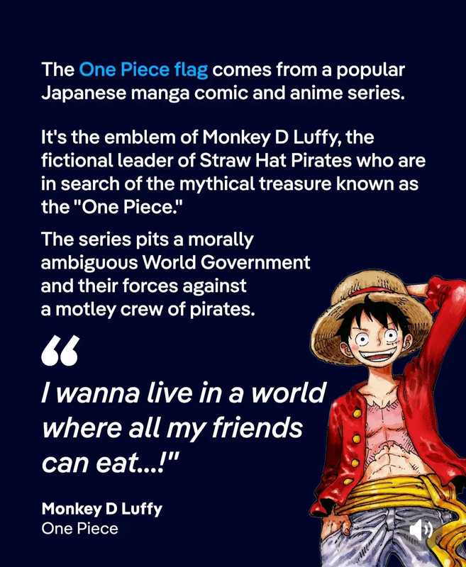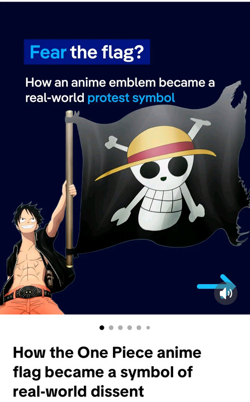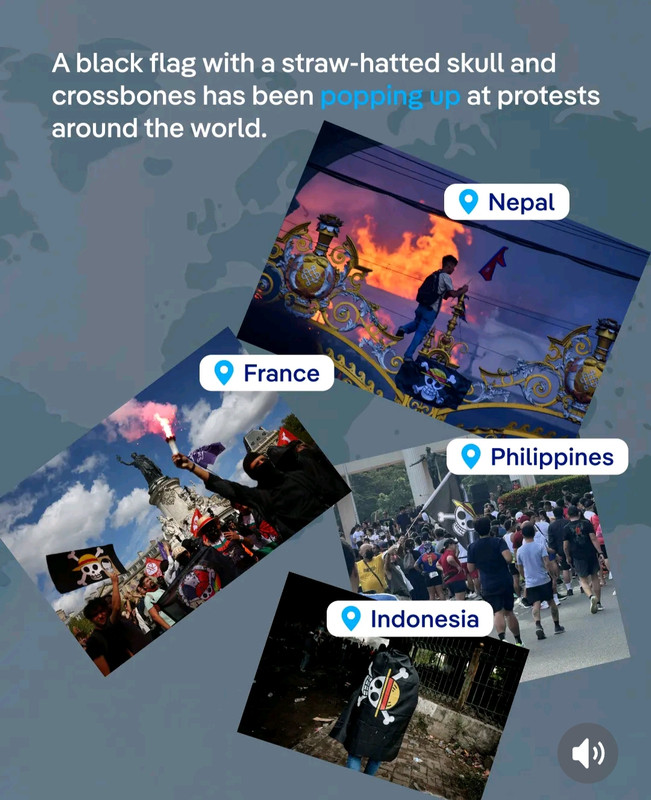 Celes Inviato 25 settembre Inviato 25 settembre Sapevate della notizia sul fatto che la bandiera di One Piece (ovvero la bandiera della ciurma di Cappello di Paglia), è diventata un simbolo di protesta in tutto il mondo per le guerre che stanno accadendo oggigiorno? Sempre in piú manifestazioni e rivolte si vedono bandiere col Jolly Roger di Luffy come segno di libertà, giacchè Luffy e ciurma sono portatori di pace ovunque vanno. Riporto queste immagini da un post che parla di questa notizia: Spoiler La frase emblema di Luffy: "Voglio vivere in un mondo dove tutti i miei amici possono mangiare a sazietà!" Di questo stesso argomento, mi è capitato anche questo video, di un autore che si occupa di giornalismo, che spiega bene e in modo sintetico perché proprio la bandiera di One Piece: Spoiler Ottima spiegazione e sintesi per chi non conosce One Piece Unica cosa però che può pensare chi non ha visto OP con questa sintesi, è che i pirati siano tutti buoni e i marine tutti cattivi, quando invece ci sono tantissimi pirati cattivi in OP e ci sono anche marine buoni. Quindi alla fine, i buoni e i cattivi sono schierati in entrambe le parti. È il Governo Mondiale il vero problema di tutto che sta a monte Comunque bella spiegazione, che fa capire anche perché One Piece è un capolavoro e un'opera cosí attuale per chi non lo conosce @evilespeon @.Zen. @Diamaxus @DarthMizu E' stata aggiunta una reazione da .Zen. e Diamaxus 1 1 ~ LA MIA ART GALLERY ~ (Credits dolls + altre fan-dolls in spoiler :3) (Joy and Flareon signatures made by me ^-^) Spoiler (dolls di Kukui e Burnet by @Porygatto) <Alola! <It's champion time!(dolls di Kukui, Dandel e me create da me) Ringrazio tanto @Mana per queste doll di Kukuino Royalino e per Dandelino Diamantino Set Kukui Mr. Royale by @Alemat. Grazie mille!! :3 Sprite creato per me da @Alemat per la serie "Utenti di PM" :3 Kukuino Surfer creato per me by @Alemat Sonia Regina (Masters) by @Diamaxus Grazie a @Fr4nciX per queste doll di Flareon e Gardevoir versione hanami :3 E a @Freedom per questi altri recolor :3 E per questi Kukuini: Kukuino bagnino scintilloso e con Ho-Oh stellare pure e Kukuino Royalino Tribale {Happy Pokemon journey...and may the Shinies be with you!} Clone Wars sprites (source: web) Grazie ancora a @Mana anche per le doll di me stessa (vicino a Flareon :3) e per Furret shiny :3 MegaGardevoir di tipo Fuoco! *-* creata per me da @DaniGrovyle
