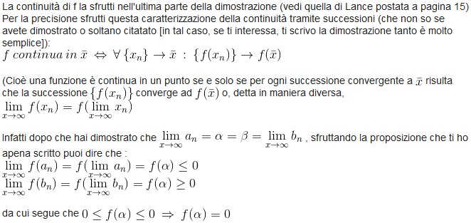 A) Forse mi sono spiegato male io xD La continuità  serve per giungere alla disuguaglianza 0<= f( c)<=0 (e stop). Da qui, a concludere che f( c)=0 la continuità  non serve più :3