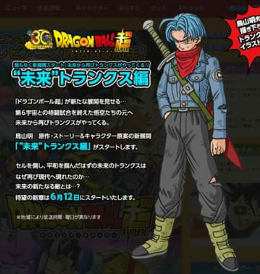 Confermato il ritorno di Mirai Trunks! Pare sia in fuga da qualcosa (anche stavolta) e che questo qualcosa, indicato come "BLACK GOKU?!?", sia in grado di scatenare una guerra che coinvolgerà anche gli dei della distruzione e Zeno.
